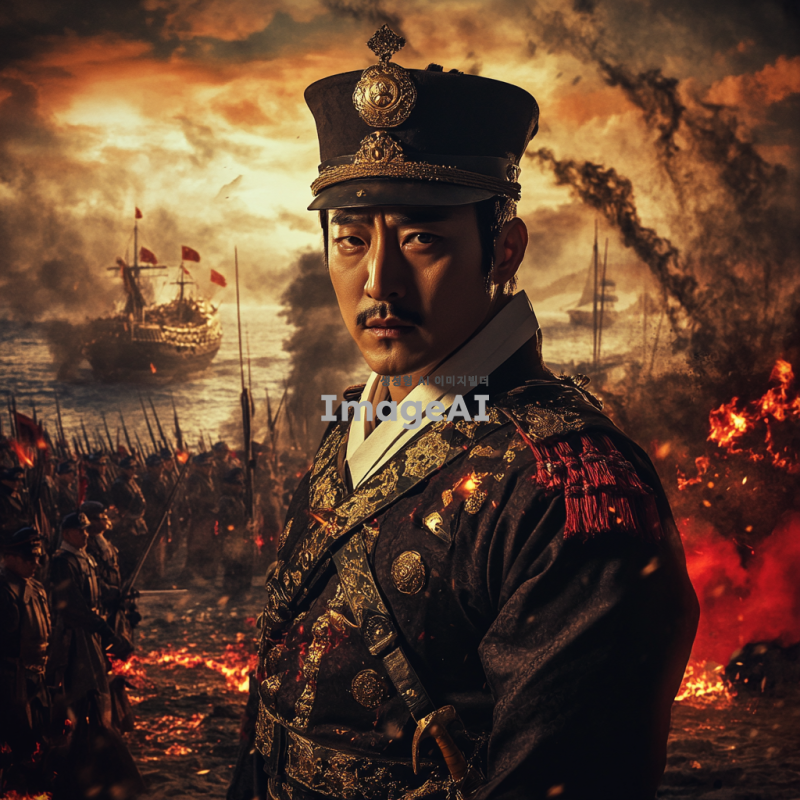 이순신 장군을 중심으로 한 역사적인 장면, 장군의 전투복을 입고 있는 모습, 강한 결단력을 지닌 표정, 전통적인 한국의 전투 배경, 동아시아의 전통적인 해양 전투, 바다와 전투선, 조선 시대의 군사적 분위기, 역동적인 포즈, 강렬한 색감, 드라마틱한 조명, 전통적인 한국의 미를 강조한 스타일.