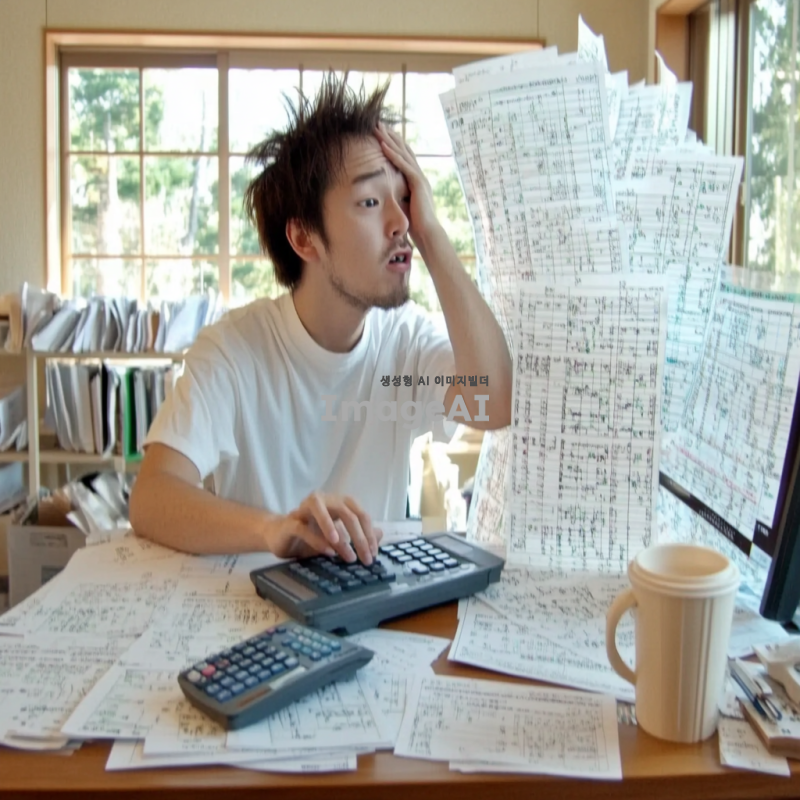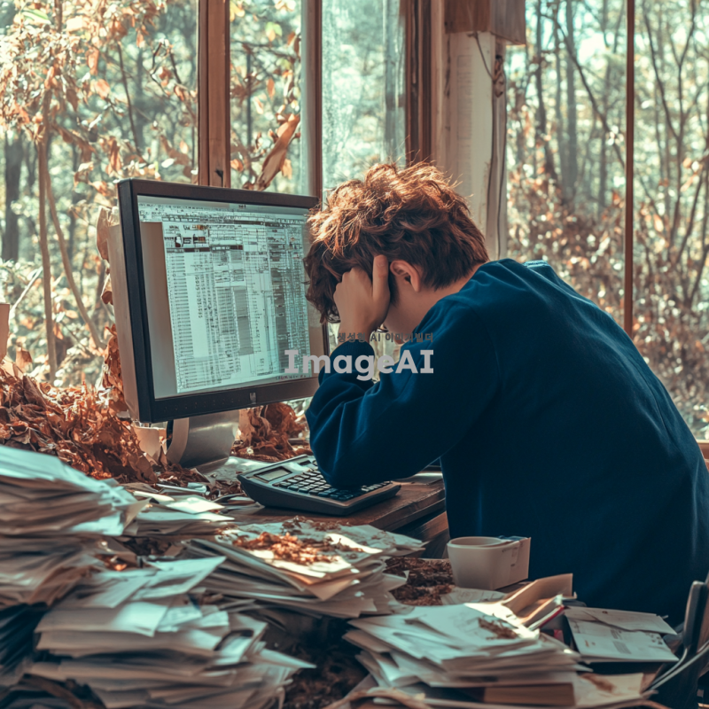 한국의 사무실에서 세금 문제로 고민하는 젊은 남성의 모습. 그는 책상에 앉아 있고, 컴퓨터 화면에는 세금 신고서와 계산기가 놓여 있다. 그의 표정은 걱정스럽고, 손에 머리를 감싸 쥐고 있다. 주변에는 서류 더미와 커피 컵이 흩어져 있어 바쁜 분위기를 자아낸다. 조명은 부드럽고 자연광이 들어오며, 현실감 넘치는 디테일로 표현해 주세요.