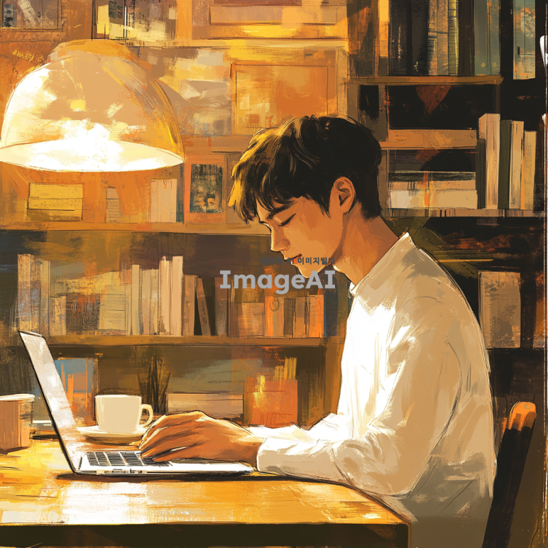 카페의 타이틀 이미지로, 공부하는 순간에 결실을 향해 첫 발을 내딛는 모습을 담고 있습니다. 절박함과 학습의 과정을 강조하며, 도전 의지를 가진 한국 남성이 홀로 서기 위해 노력하는 모습이 그려집니다. 배경에는 기술과 규율을 통해 성장하는 과정을 상징적으로 나타내기 위해 커피 컵, 책, 노트북이 따뜻한 카페 분위기와 조화를 이루고 있습니다.