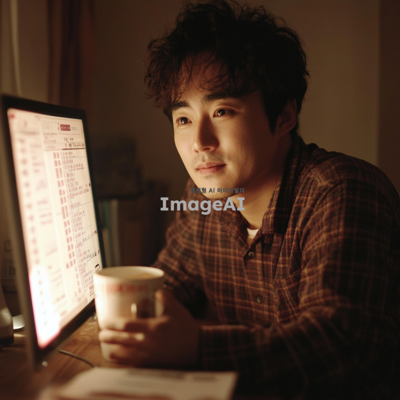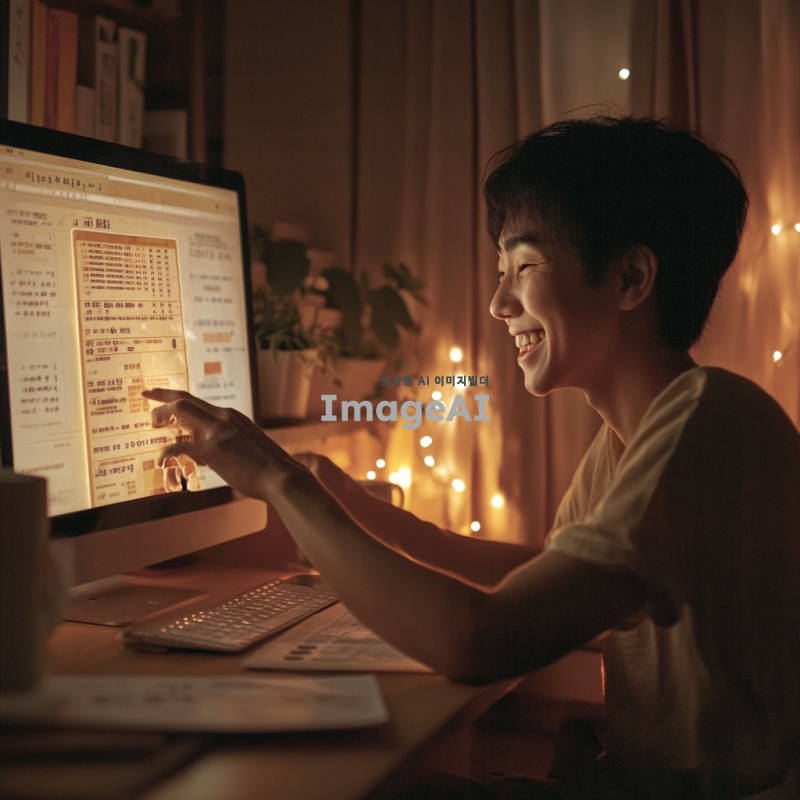 어두운 방 안에서 빛나는 컴퓨터 화면을 바라보며 행복한 표정을 짓고 있는 한국인 남성. 화면에는 세금 환급 금액이 표시되어 있고, 그의 얼굴에는 안도감과 기쁨이 가득하다. 방 안에는 월세 고지서가 놓여 있고, 그가 내일 렌트비를 걱정하지 않아도 되는 상황을 표현. 주변은 따뜻한 조명으로 아늑한 분위기를 연출하고, 남성의 손에는 커피 컵이 들려 있다.