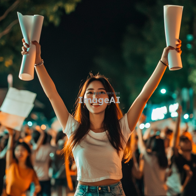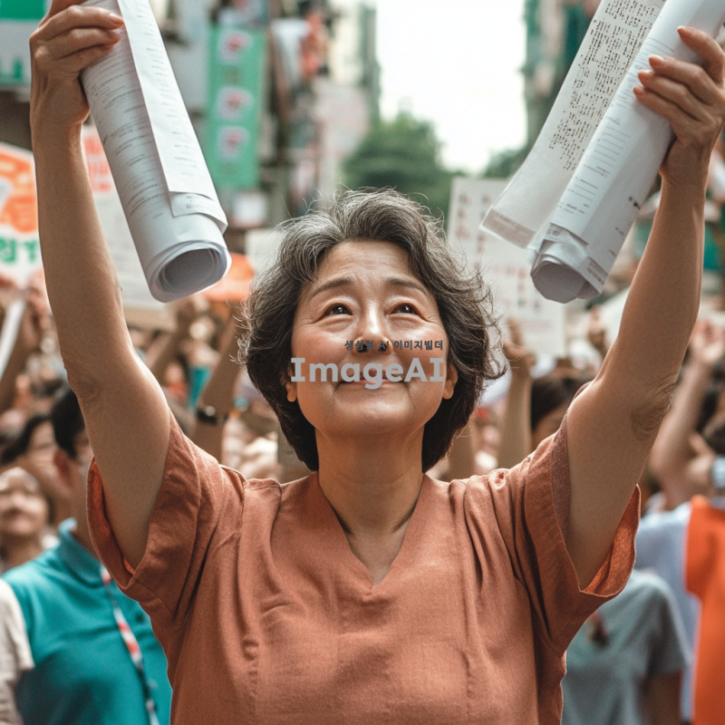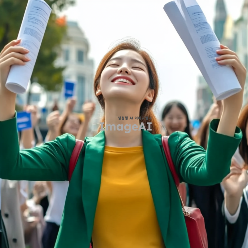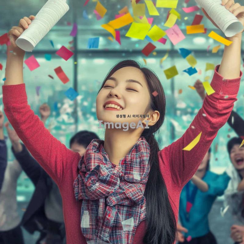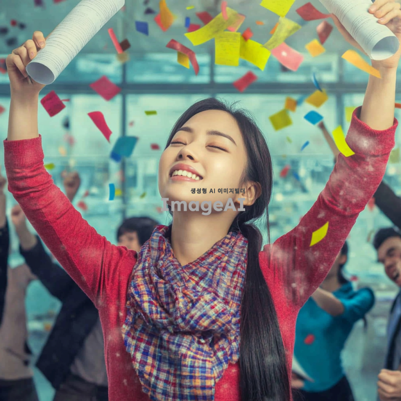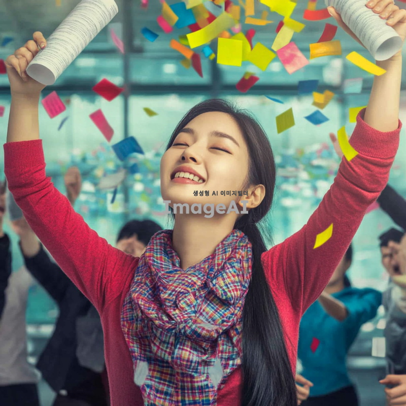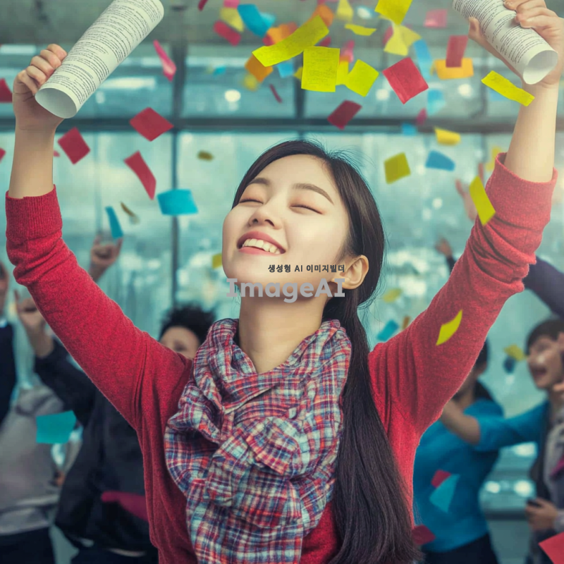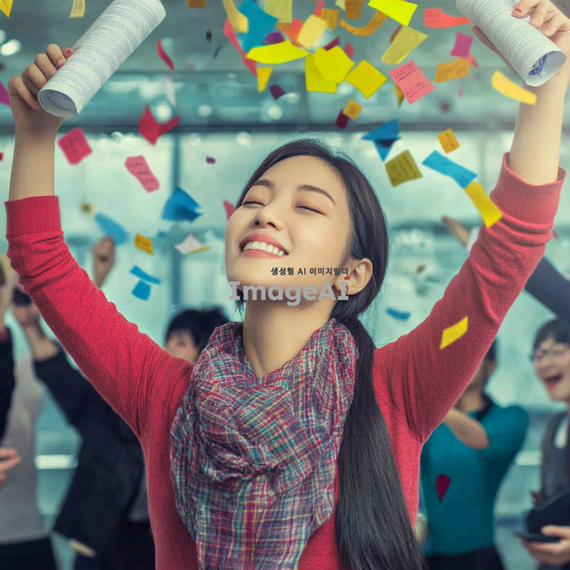 어려운 문제가 해결되어 승리의 포즈를 취하는 한국 여성, 밝은 분위기의 배경, 주변에서 축하하는 사람들, 약간 하늘을 응시하며 양손에 말린 서류를 쥐고 있는 모습.