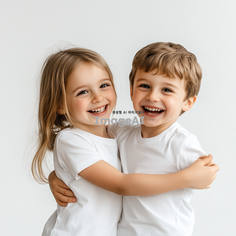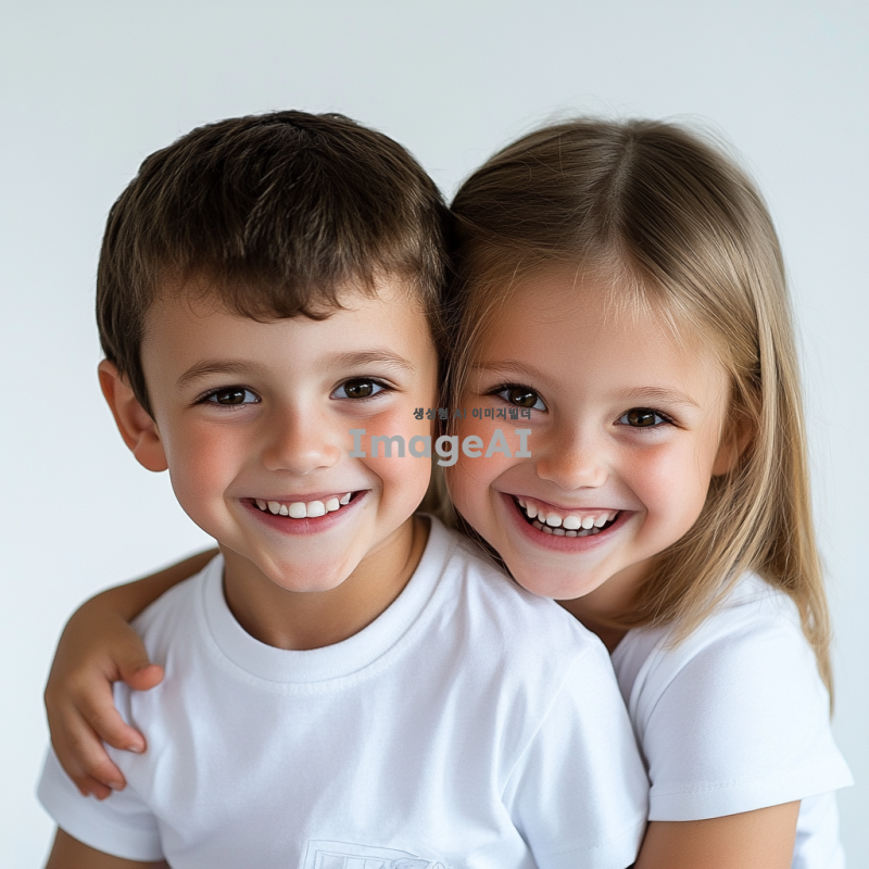 6살 남자아이와 여자아이가 흰색 티셔츠를 입고 환하게 웃으며 함께 놀고 있는 모습. 배경에는 흰색 스튜디오