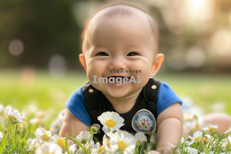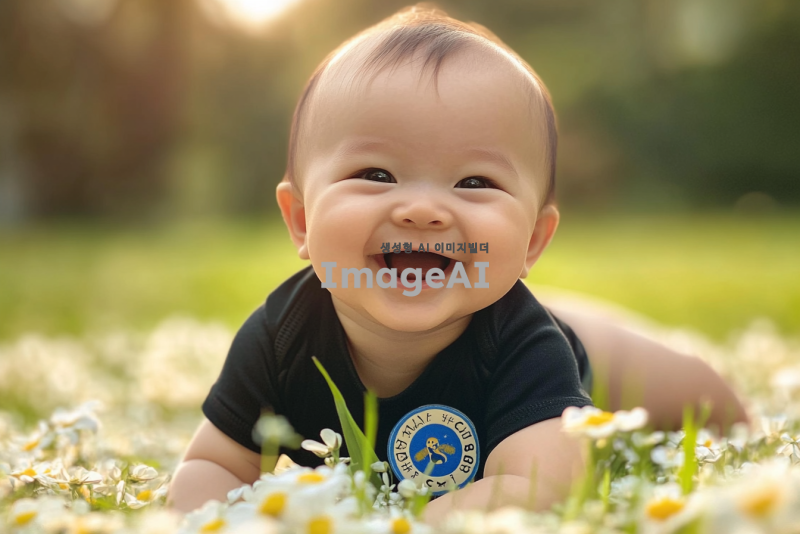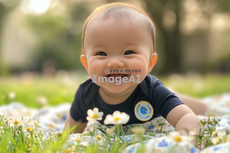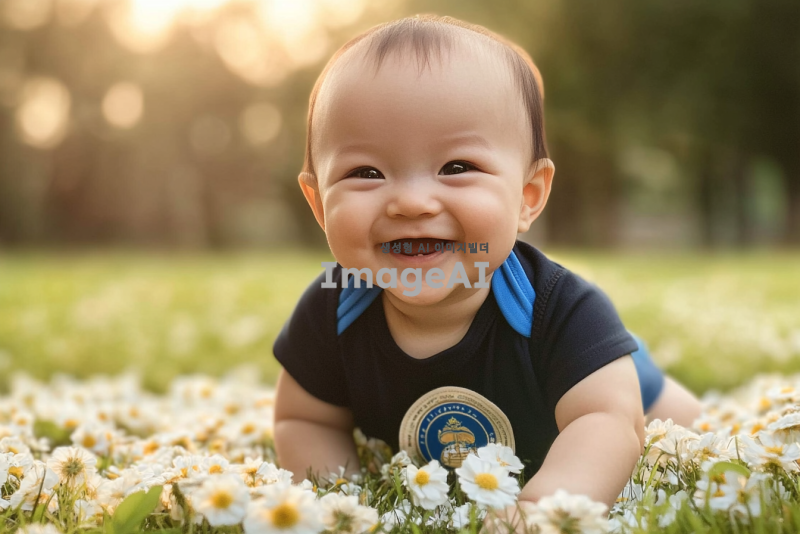 아기가 공원에서 놀고 있는 모습, 푸른 잔디와 나무들이 배경에 있는 자연스러운 사진, 햇살이 부드럽게 비치는 따뜻한 분위기, 아기는 웃고 있으며 주변에 꽃들이 피어 있는 모습.