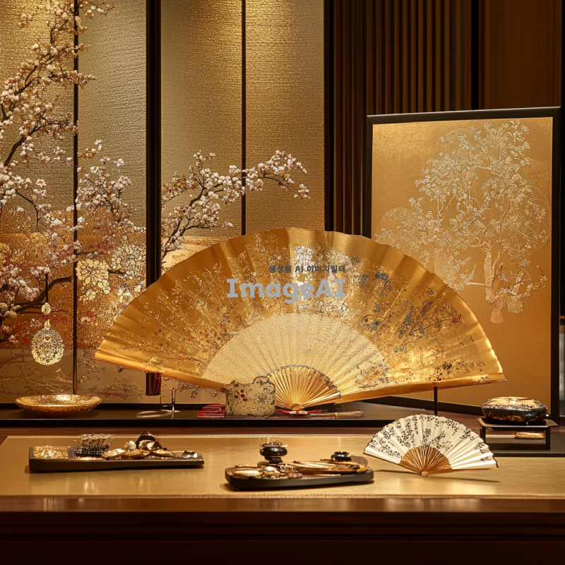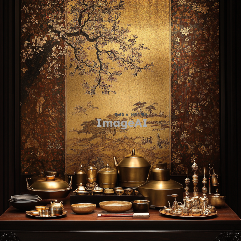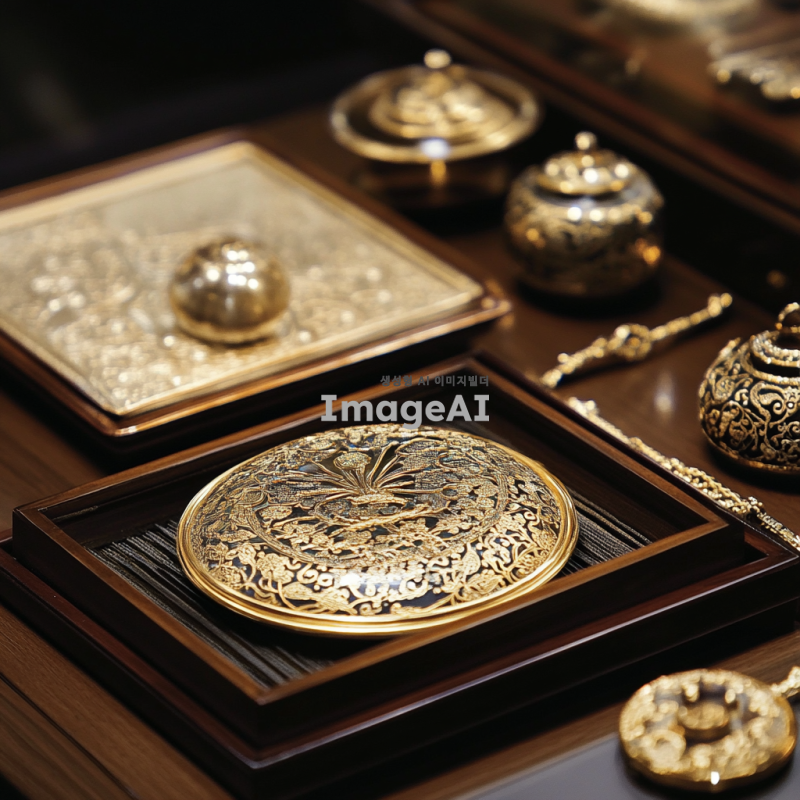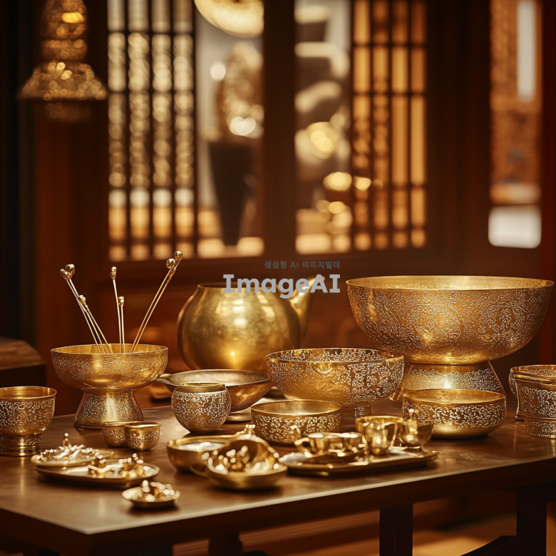 한국 전통 금속 공예품을 배경으로 한 장면, 정교하게 디자인된 금으로 장식된 소품들, 빛나는 금빛이 강조된 디테일, 한국 전통 문양이 새겨진 금속 작품, 따뜻한 조명 아래에서 반짝이는 금속의 아름다움, 고풍스러운 분위기, 세련된 한국의 문화적 요소가 어우러진 이미지