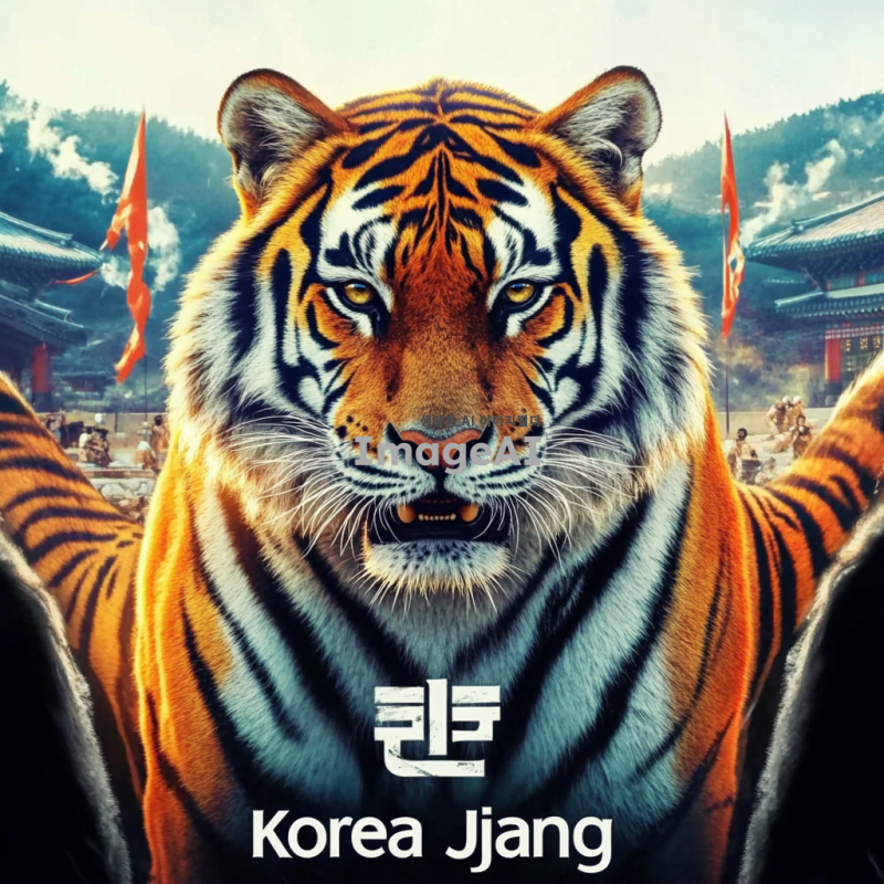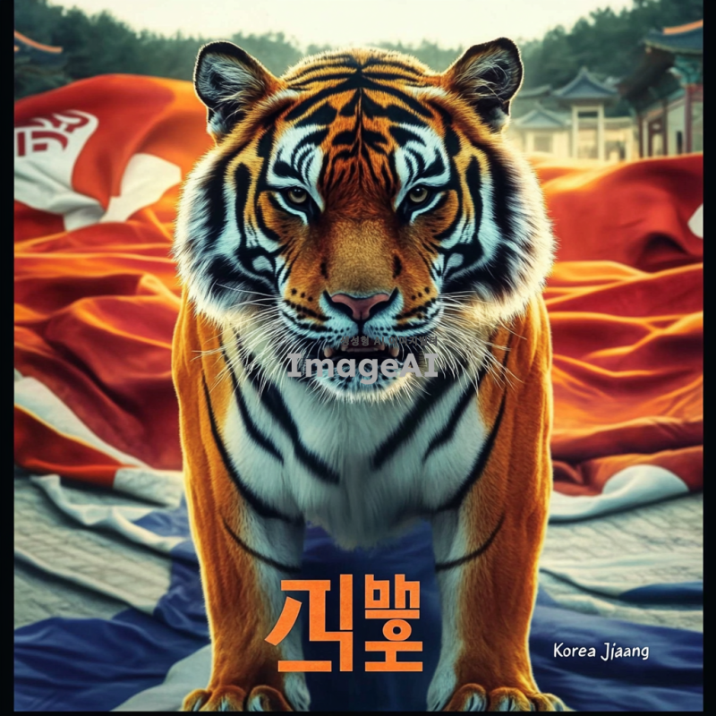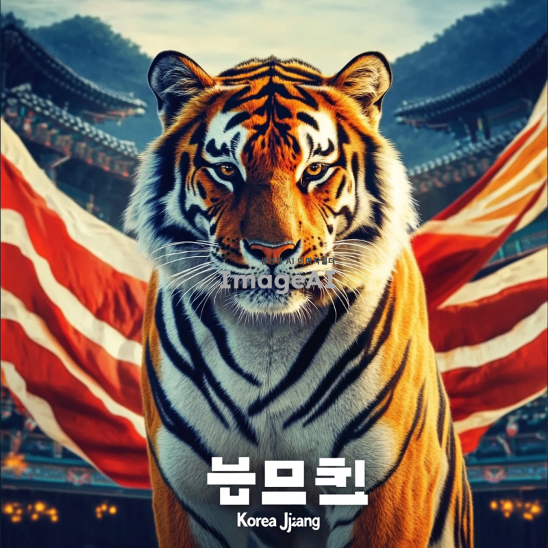 큰 태극기가 배경에 펼쳐져 있는 장면. 호랑이가 용맹하게 서 있으며, 사납고 강렬한 표정을 짓고 있다. 호랑이의 앞쪽에는 "코리아짱"이라는 글자가 뚜렷하게 보인다.