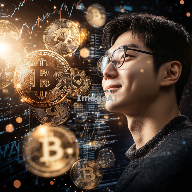 비트코인 웰컴 보너스를 주제로 한 이미지, 현대적인 느낌의 디지털 환경 속에 금색 비트코인 동전이 반짝이며 쌓여 있는 모습, 배경에는 블록체인 그래픽과 상승하는 차트가 어우러져 있고, 한국인 남성이 기뻐하는 표정을 지으며 동전을 바라보는 장면, 밝고 희망적인 분위기, 테크놀로지와 재정의 결합을 강조한 디자인.