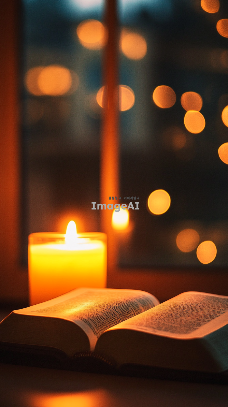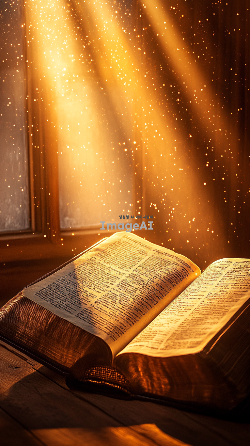 따뜻한 빛이 비추고 음악이 흐르는 배경에 성경이 펼쳐져 있고, 성경 뒤로는 하느님과 이스라엘 백성들이 이야기를 나누고 있는 모습, 따뜻하고 거룩한 분위기