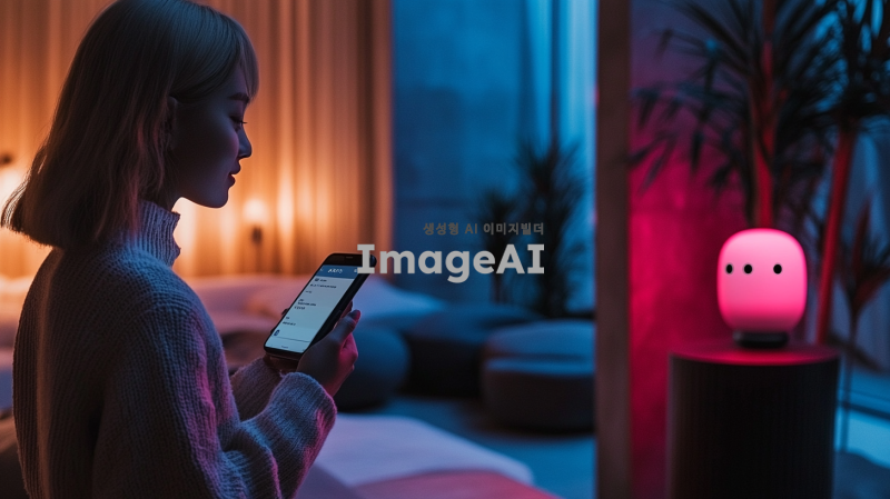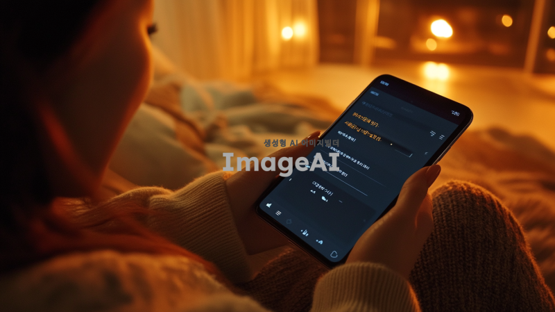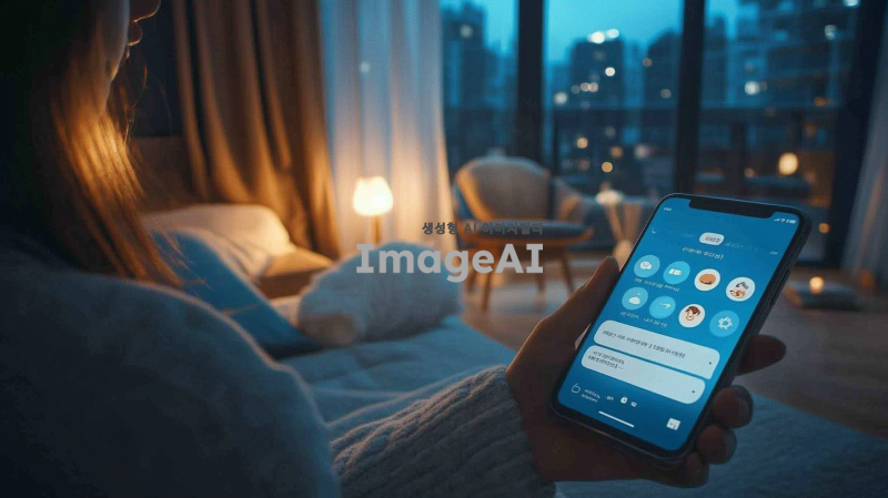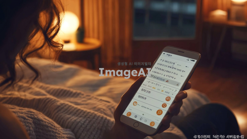 세로, 가로 2:4 비율의 이미지로, 핸드폰 화면에 챗봇과 대화하는 장면을 그려줘. 화면에는 한국어로 대화하는 챗봇의 인터페이스가 보이고, 사용자는 집중해서 대화 내용을 읽고 있는 모습이다. 배경은 현대적인 실내 공간으로, 따뜻한 조명이 비추고 있어 편안한 분위기를 연출한다. 핸드폰은 최신 모델로, 화면에는 다양한 이모티콘과 메시지가 표시되어 있다.