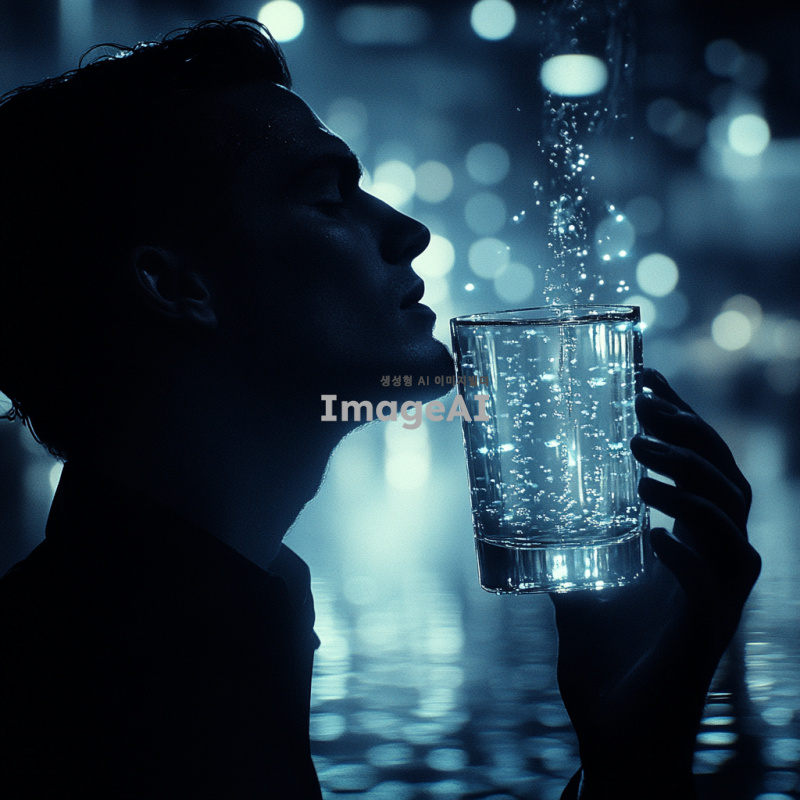 어두운 공간에서 여자 향수를 맡고 있는 남자의 모습, 남자는 깊은 생각에 잠겨 있으며, 주변은 흐릿한 조명으로 감싸여 있다. 그의 표정은 상념에 잠긴 듯하며, 향수의 향기가 그를 매료시키고 있는 듯한 느낌을 주고 있다. 배경은 어둡고 신비로운 분위기를 연출하며, 남자의 실루엣이 강조된다.
