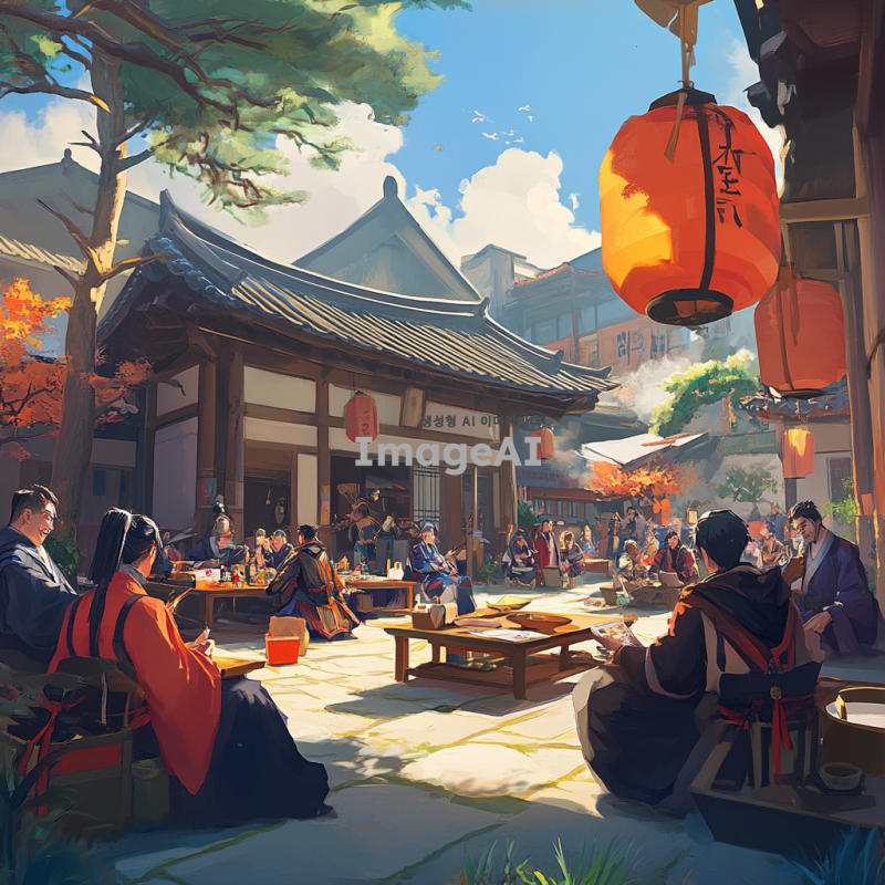40대 한국인들이 Valorant 게임을 즐기기 위해 모인 클랜 회의의 외부 풍경, 사람들이 게임을 하고 있는 모습, 다양한 표정과 활동이 담긴 장면, 자연스러운 대화와 웃음이 오가는 분위기, 게임 관련 소품과 장비가 배치된 환경, 따뜻한 햇살 아래에서의 활기찬 모습