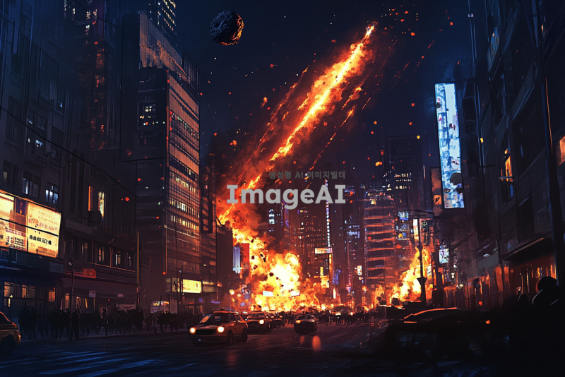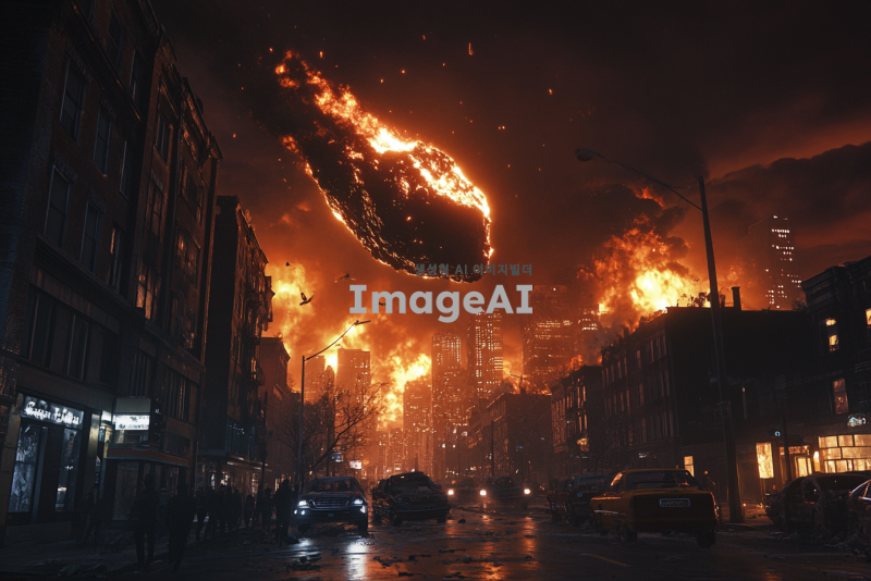 어두운 밤하늘에 소행성이 도시 위로 떨어지는 장면, 소행성이 대기권에 진입하면서 불타오르고 있는 모습, 도시의 고층 건물들이 흔들리며 붕괴되는 모습, 거리에는 혼란에 빠진 사람들과 차량들이 있는 모습, 배경에는 불길과 연기가 가득한 하늘, 긴장감 넘치는 분위기, 사실적인 스타일로 표현된 이미지