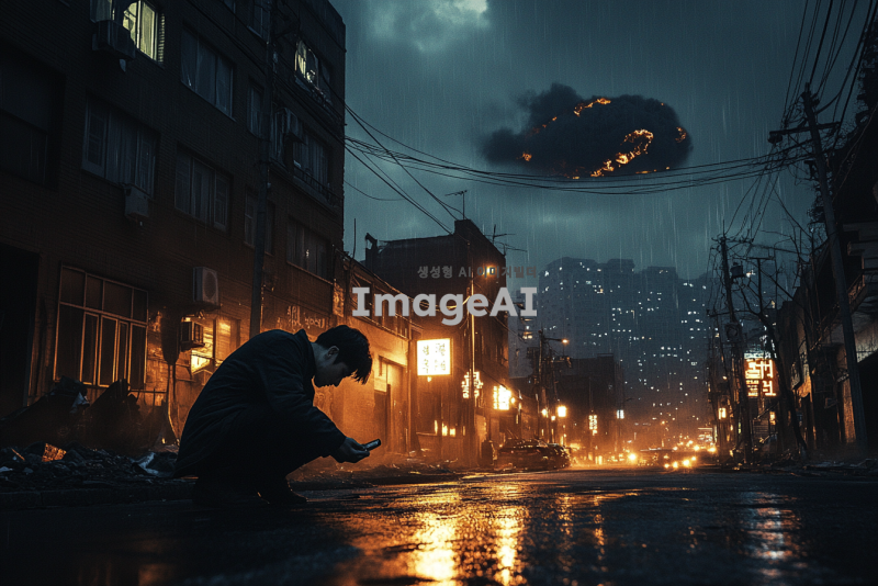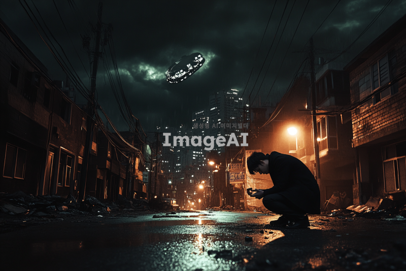 어두운 도시의 길가에서 슬퍼하고 있는 한국 남자의 모습. 주변은 폐허가 된 건물과 어두운 골목으로 가득 차 있으며, 흐릿한 가로등 불빛이 그의 얼굴을 비추고 있다. 남자는 고개를 숙이고 손에 쥔 물건을 바라보며 깊은 생각에 잠긴 표정을 짓고 있다. 도시의 분위기는 음산하고 우울하며, 배경에는 흐린 하늘과 비가 내리는 모습이 보인다.