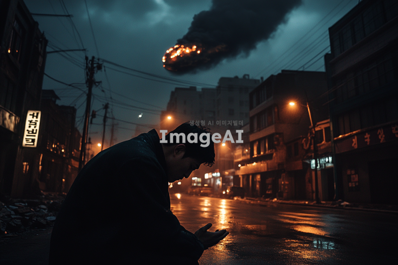 이미 망한 어두운 도시 길가 위에서 슬퍼하고 있는 한 남자.