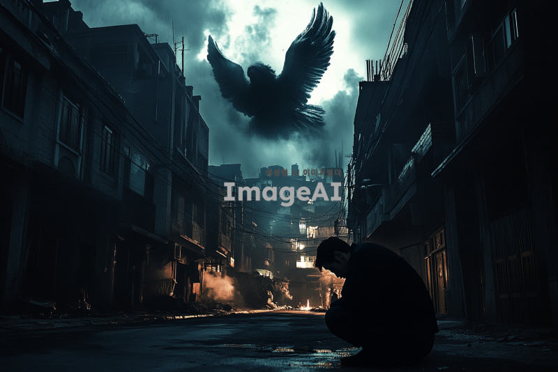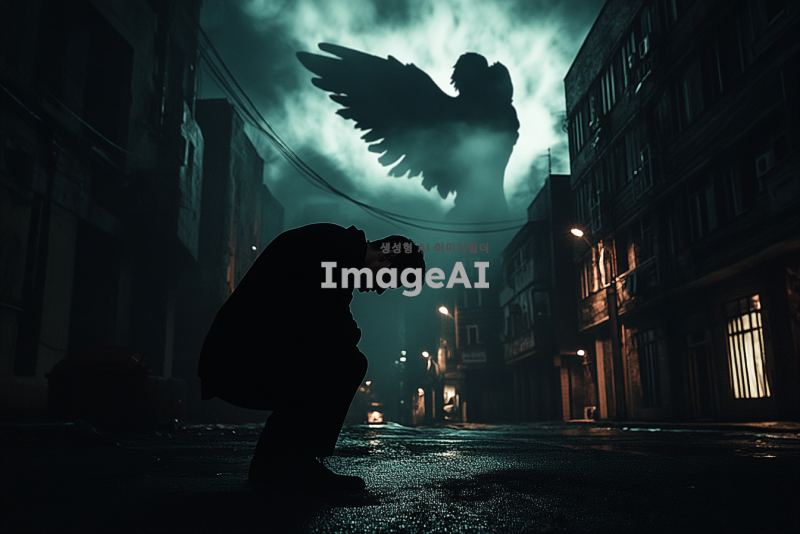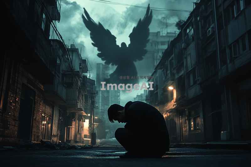 어둡고 황폐한 도시의 거리에서 슬픔에 잠긴 한 남자의 뒷모습, 그의 뒤로 신비로운 천사의 그림자가 드리워져 있는 장면. 도시의 건물들은 낡고 부서져 있으며, 흐릿한 조명이 어두운 분위기를 더하고 있다. 남자는 고개를 숙이고 있으며, 그의 주변에는 쓸쓸한 느낌이 감돈다. 천사의 그림자는 남자의 슬픔을 위로하는 듯한 모습으로, 부드러운 빛이 그 주위를 감싸고 있다.