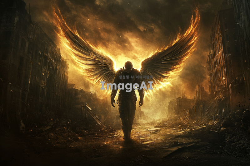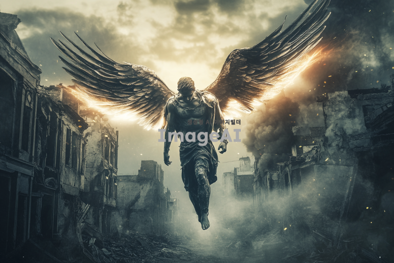 어두운 망한 도시의 황량한 거리 위에서 둥둥 떠 있는 남성 천사. 그의 날개는 빛을 발하며, 슬퍼하는 남자를 위로하려는 구세주의 모습. 배경은 폐허가 된 건물들과 어두운 구름으로 가득 차 있으며, 천사의 표정은 따뜻하고 희망적인 느낌을 주고 있다.