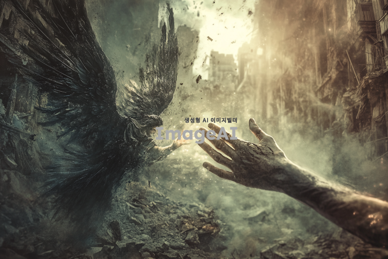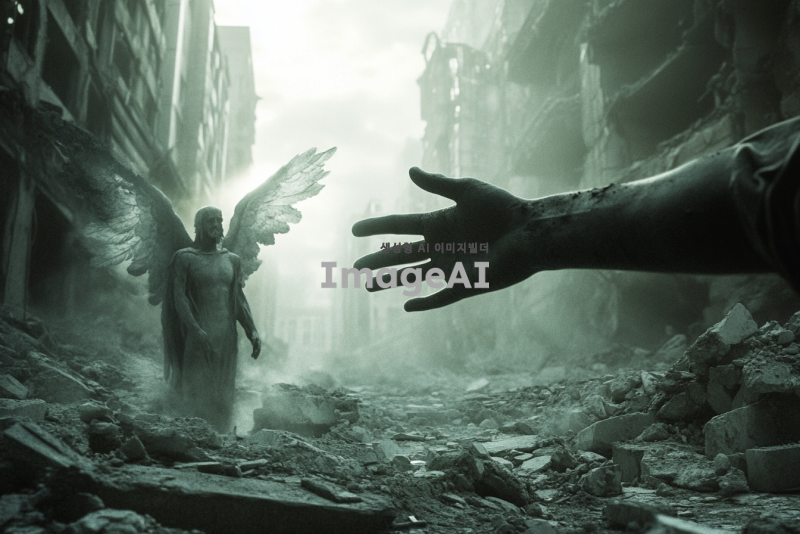 붕괴된 도시의 잔해 속에서 슬퍼하는 남자의 손과 그를 구원하기 위해 나타난 천사의 손이 닿을 듯 말 듯 하는 장면. 배경은 황량한 도시 풍경으로, 먼지와 잔해가 가득한 분위기. 천사의 손은 빛나는 느낌으로 표현되고, 남자의 손은 힘없이 떨어져 있는 모습. 전체적으로 신비롭고 감정적인 분위기를 강조하여, 천지창조의 느낌을 담아내기.