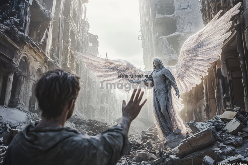 붕괴된 도시 속에서 절망한 남자가 구세주 천사의 손을 잡으려고 하는 장면. 두 손이 닿으려고 하는, 손 부분만 장면 구성. 배경은 황량한 도시의 잔해로 가득 차 있음. 분위기는 희망과 절망이 교차하는 느낌을 담아내고, 천사는 부드럽고 따뜻한 빛을 발산. 명화 천지창조처럼 손이 서로 닿으려고 하는 느낌.
