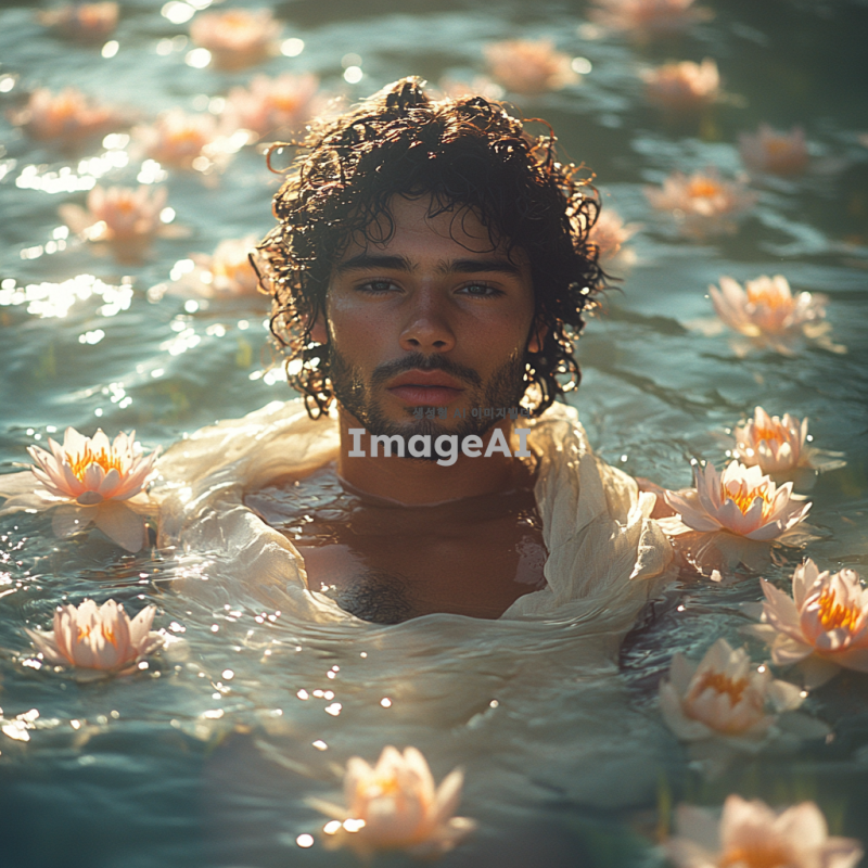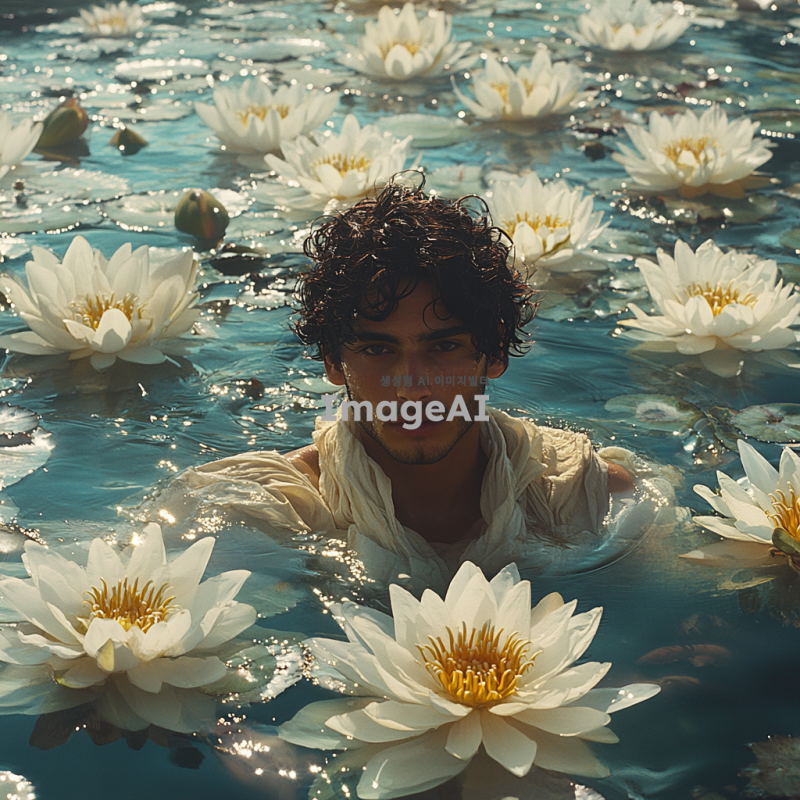 고대 이집트 복장을 한 젊은 이집트 남성이 연꽃이 만발한 물속에 잠겨있는 모습. 부드러운 햇살이 물속으로 비추고, 연꽃들이 화사하게 피어있는 배경. 남성의 표정은 평온하고 신비로운 분위기를 자아내며, 물의 흐름과 함께 우아하게 움직이고 있다.