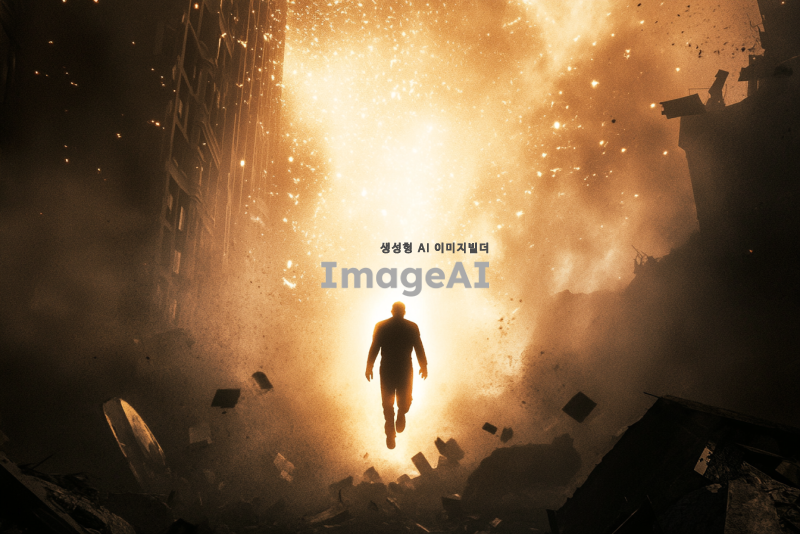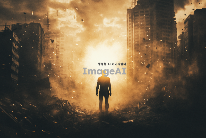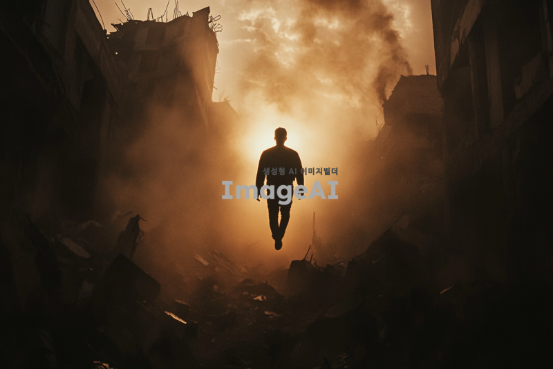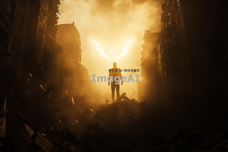어두운 도시의 배경 속에서 빛나는 남성의 실루엣이 하늘에서 내려오는 장면. 붕괴된 건물과 잔해들 사이로 비치는 따뜻한 빛이 천사 같은 느낌을 주며, 희망과 구원의 상징처럼 보인다.