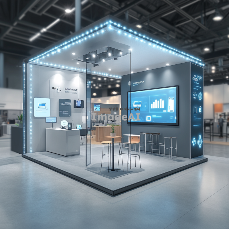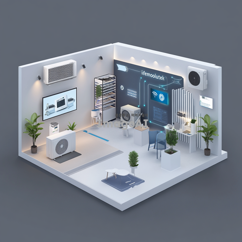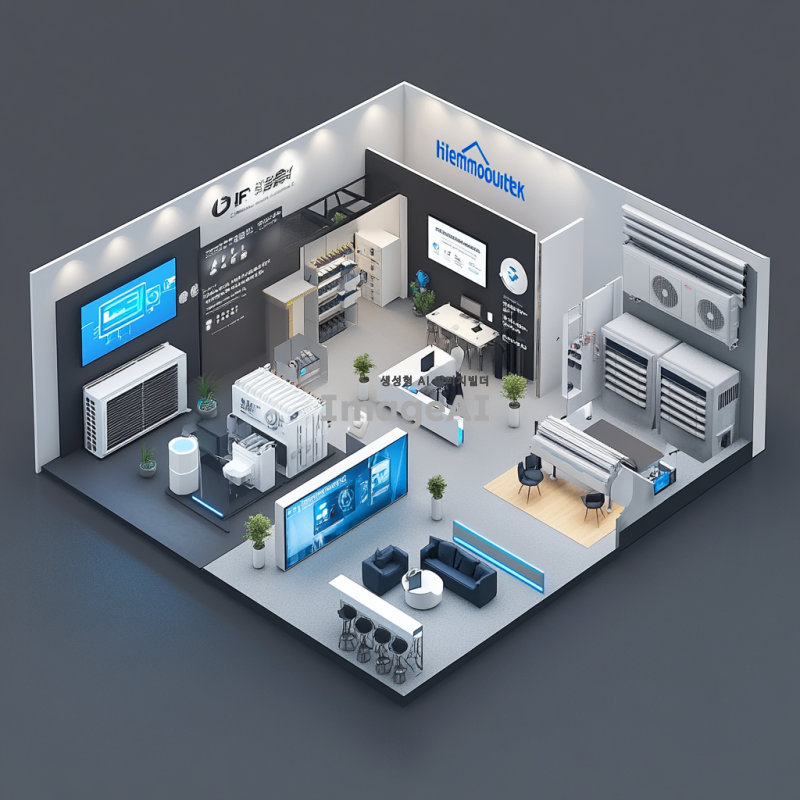 9x9 부스 내부의 다양한 존을 포함한 IFS 프랜차이즈 창업산업 박람회 장면을 그려주세요. 부스 안에는 에어컨 유지보수 시연 존, IoT 모니터링 존, HVAC 기술을 소개하는 디지털 스크린, B2B 미팅룸으로 활용되는 상담 공간, 하이엠솔루텍 브랜드를 소개하는 브랜드 존, 그리고 창고 및 스태프 공간이 배치되어 있습니다. 전체적인 분위기는 현대적이고 전문적인 느낌을 주며, 각 존의 기능이 잘 드러나도록 해주세요.