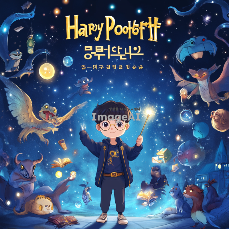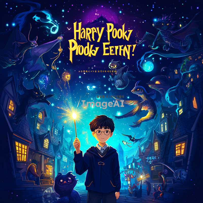 해리포터 세계관의 마법 학교를 배경으로 한 이벤트 배너 디자인. 배너 중앙에는 마법 지팡이를 들고 있는 한국인 소년이 서 있고, 그 주위에는 다양한 마법 생물과 마법 아이템들이 떠다니고 있다. 배너 상단에는 '해리포터 도서 이벤트'라는 텍스트가 환한 금색 글씨로 적혀 있으며, 배경은 신비로운 밤하늘과 별들로 가득 차 있다. 전체적인 색감은 판타지 느낌을 주는 깊은 파란색과 보라색 톤으로 조화롭게 구성되어 있다.