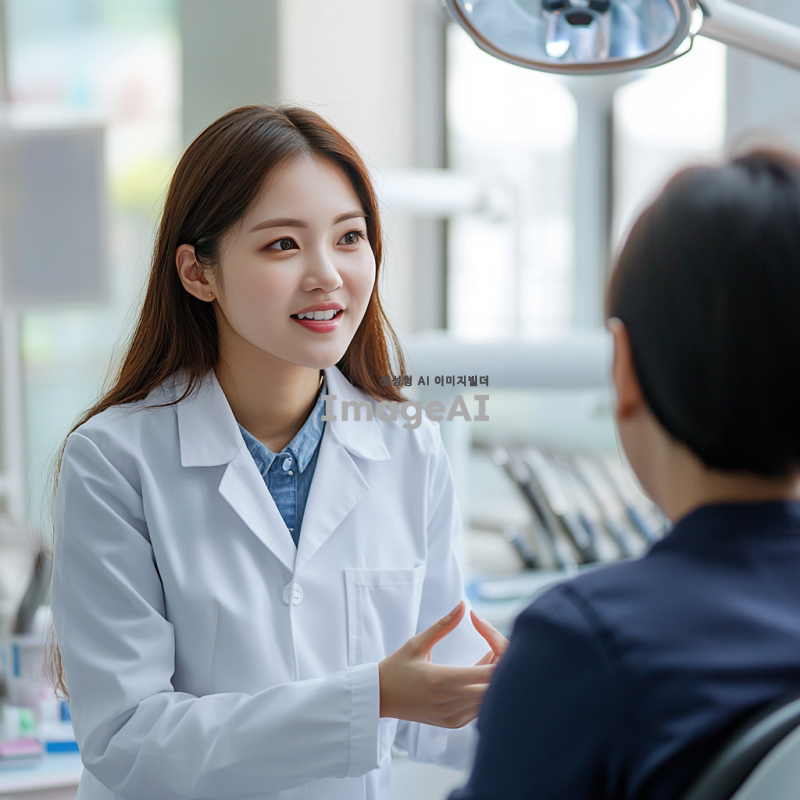 여자 치과의사가 환자와 상담하는 모습, 현대적인 치과 진료실 배경, 전문적인 표정과 친절한 미소, 청결하고 밝은 분위기, 의료 도구와 장비들이 잘 정리되어 있는 모습, 한국인 여성 치과의사, 세련된 의사복 착용, 진지한 대화 중인 장면.