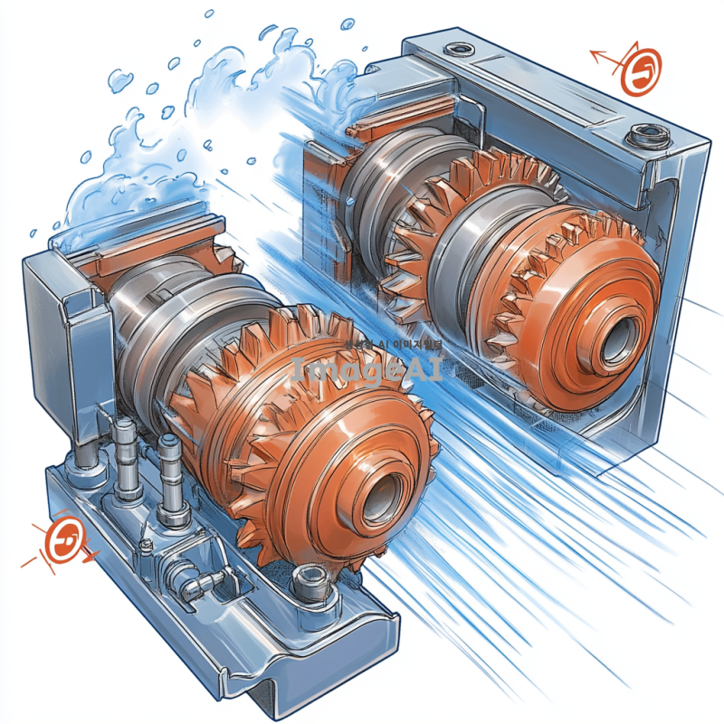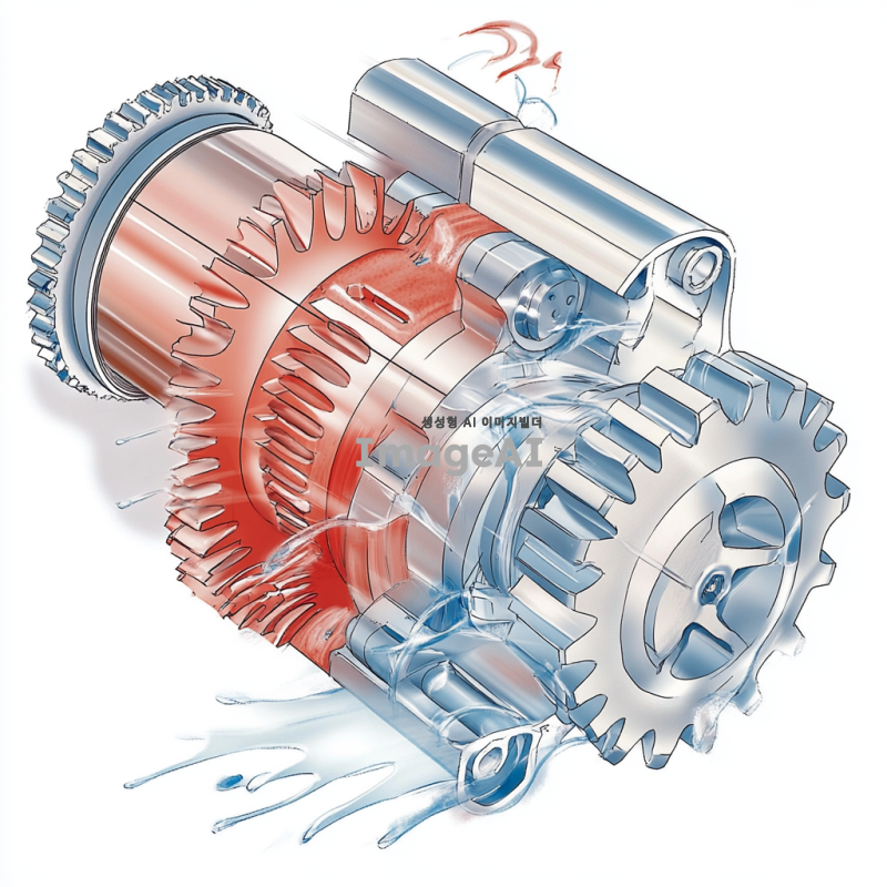 기어펌프가 열을 받아 구동이 잘 되지 않는 모습: 기어펌프가 과열되어 기어가 느리게 회전하거나 멈춰 있는 상황을 그려주세요. 기어의 표면에 열로 인한 변형이나 손상이 나타나고, 주변에 열기와 함께 경고 표시가 있는 모습을 추가해 주세요. 기어와 유체의 흐름이 원활하지 않은 상태를 강조해 주세요.