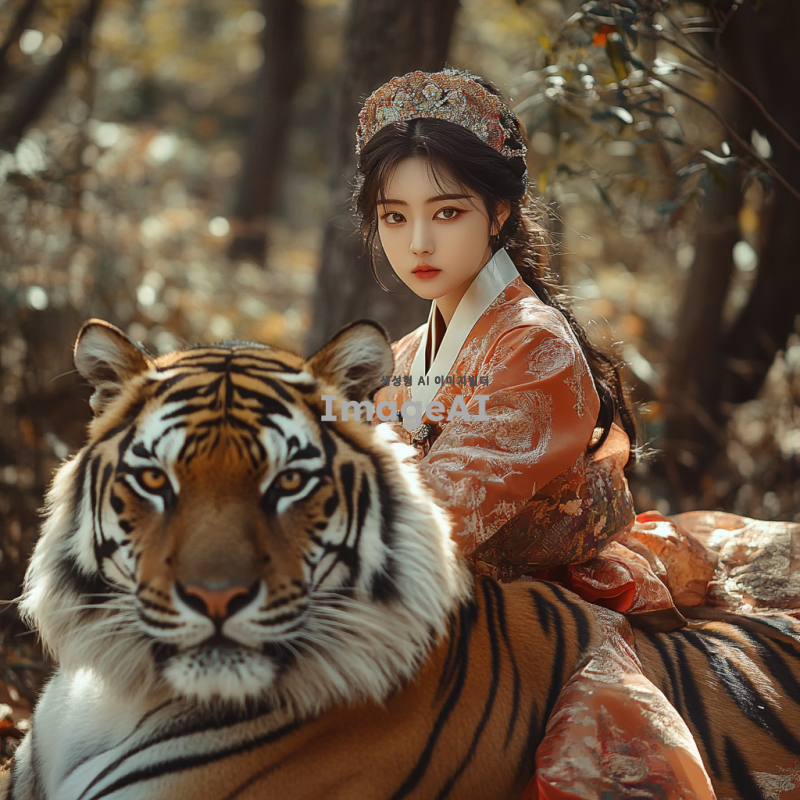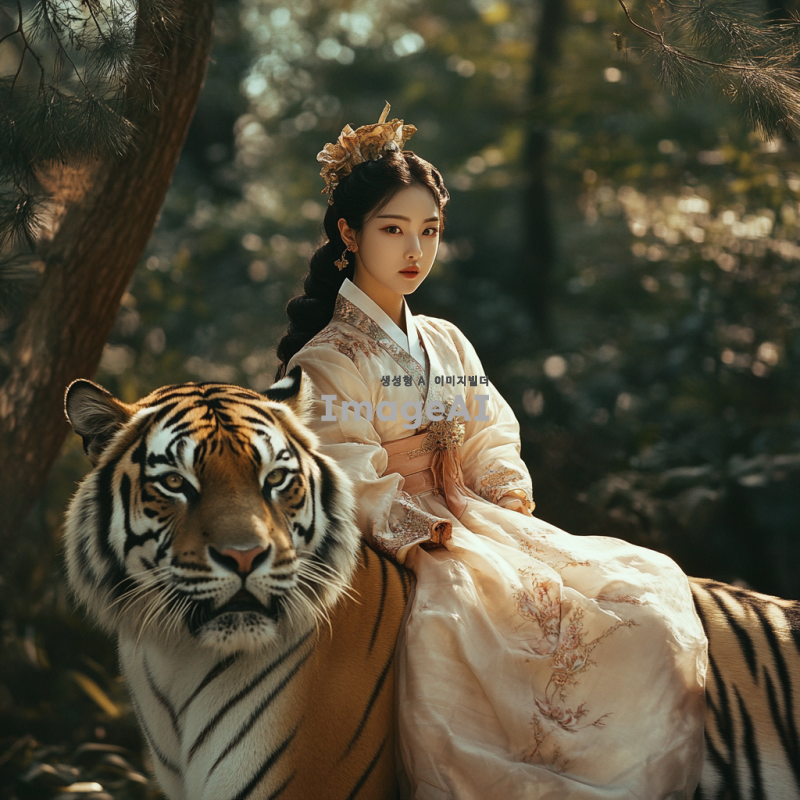 호랑이 등에 앉아있는 한국의 어우동, 전통 한복을 입고 우아한 포즈를 취하고 있는 모습, 배경은 울창한 숲과 자연, 부드러운 햇살이 비추는 장면, 동양적인 아름다움과 강렬한 호랑이의 힘이 조화를 이루는 이미지.