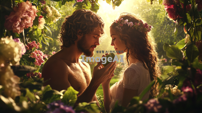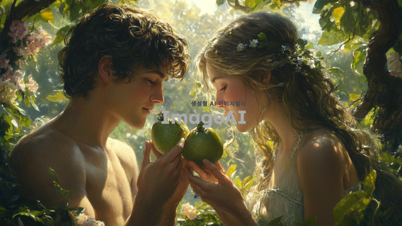 아담과 하와가 에덴동산의 아름다운 풍경 속에서 선악과를 먹고 있는 장면. 화창한 날씨와 푸르른 나무들, 다채로운 꽃들이 만발한 정원. 아담은 건강하고 근육질의 남성으로, 하와는 우아하고 아름다운 여성으로 묘사. 두 사람은 서로를 바라보며 선악과를 나누어 먹는 모습. 신비로운 분위기와 함께 신성한 빛이 그들 주위를 감싸고 있는 장면.