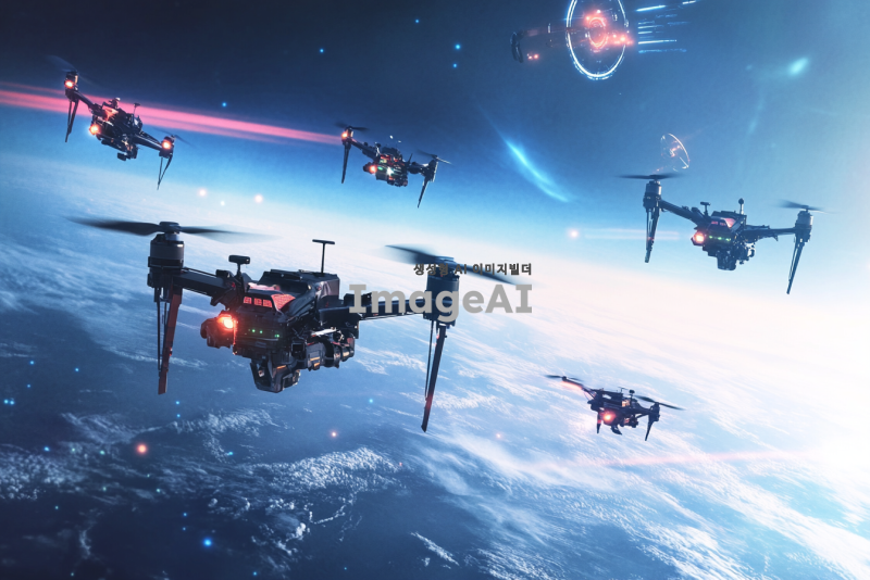 지구 낮은 위치에서 여러 대의 전투 드론들이 공중에 떠 있는 모습, 드론들은 각각 다양한 디자인과 색상으로, 하늘에는 여러 개의 위성이 떠 있으며, 드론과 위성 간의 통신이 이루어지는 장면을 생생하게 표현. 배경에는 푸른 하늘과 구름이 어우러져 있으며, 드론의 프로펠러가 회전하는 모습과 위성의 전파 송수신 장치가 강조됨.