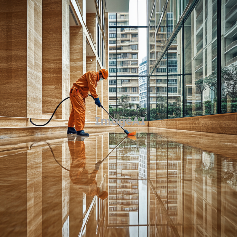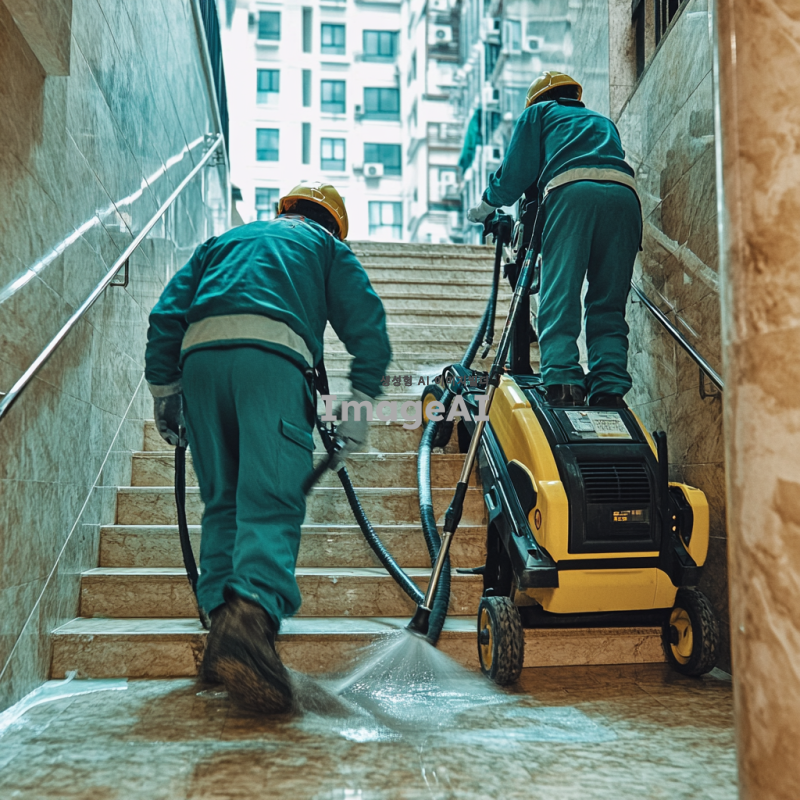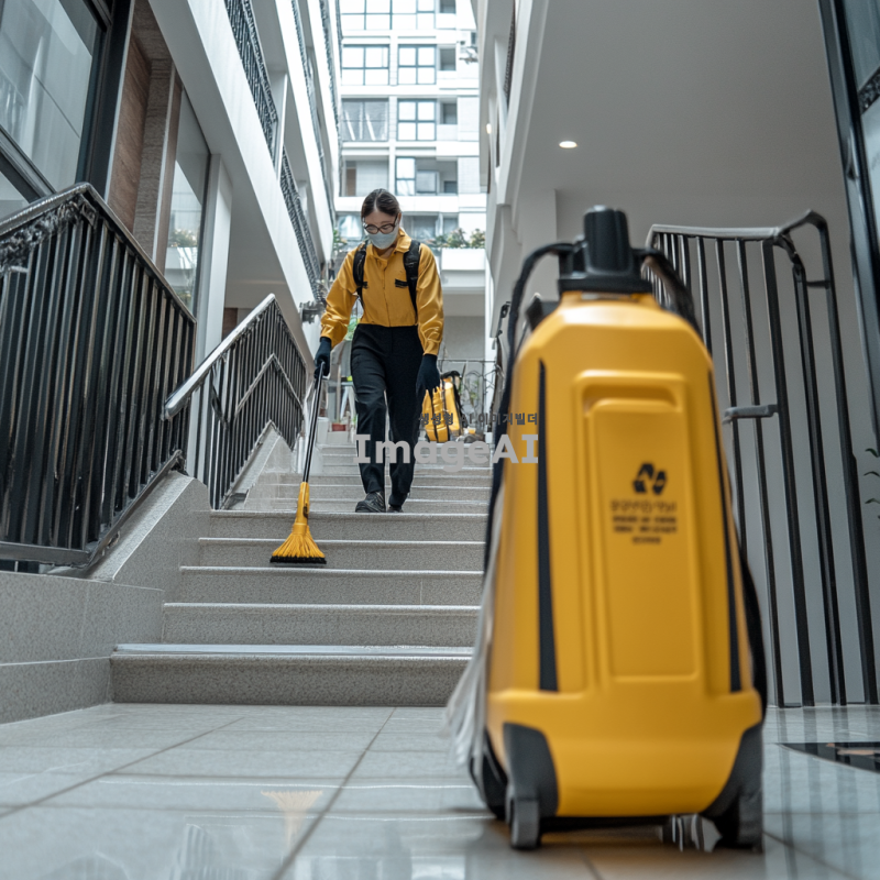 아파트 관리 직원이 계단을 청소하고 있는 모습, 깨끗하고 정돈된 아파트 단지의 내부, 밝고 환한 조명 아래에서 일하는 모습, 청소 도구와 장비가 주변에 배치되어 있는 장면, 한국의 현대적인 아파트 건물 배경, 세심하게 청소하는 직원의 표정과 자세를 강조하여 생동감 있게 표현.
