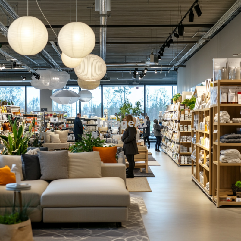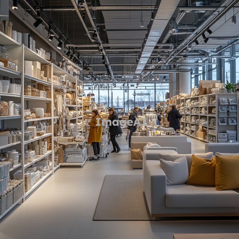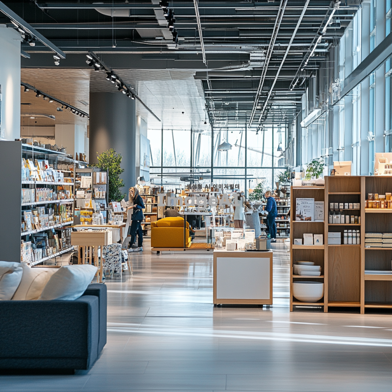 이케아 매장 내부, 현대적이고 깔끔한 인테리어 디자인, 다양한 가구와 소품들이 진열된 모습, 자연광이 들어오는 창가, 고객들이 쇼핑하는 모습, 스칸디나비아 스타일의 따뜻한 분위기, 편안한 색조와 실용적인 배치, 전체적으로 아늑하고 실용적인 공간 느낌.