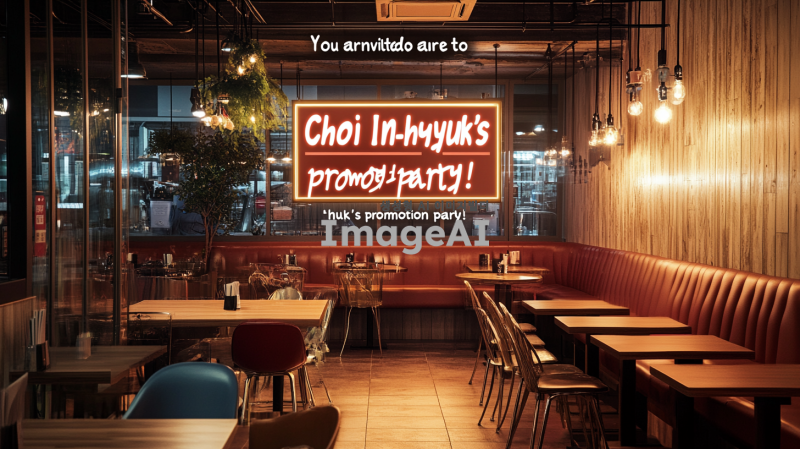 세련된 디자인의 초대장, 회사 진급 회식, 배경은 정겨운 삼겹살집 분위기의 이미지, 중앙에 "최인혁님의 진급파티에 초대합니다!"라는 문구, 현대적인 폰트 사용, 축하하는 분위기, 한국적인 요소를 가미한 세련된 느낌, 색상은 금색과 흰색 조화, 고급스러운 느낌 강조. 일자는 3월 4일 시간은 퇴근후