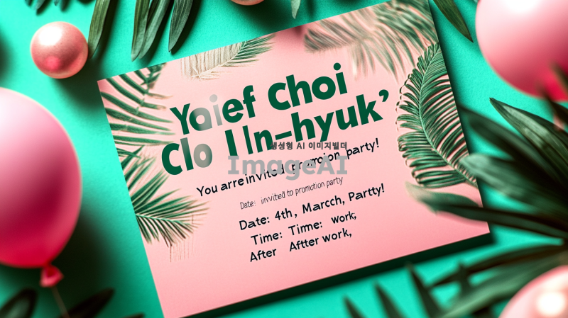 최인혁 주임의 진급파티 초대장 디자인, 배경에는 축하하는 분위기의 파티 장식, 중앙에 "최인혁 주임의 진급파티에 초대합니다!"라는 문구, 아래쪽에 "일자: 3월 4일, 시간: 퇴근 후"라는 세부 정보, 따뜻하고 환영하는 색감으로 구성, 세련된 글씨체 사용.