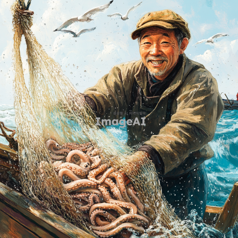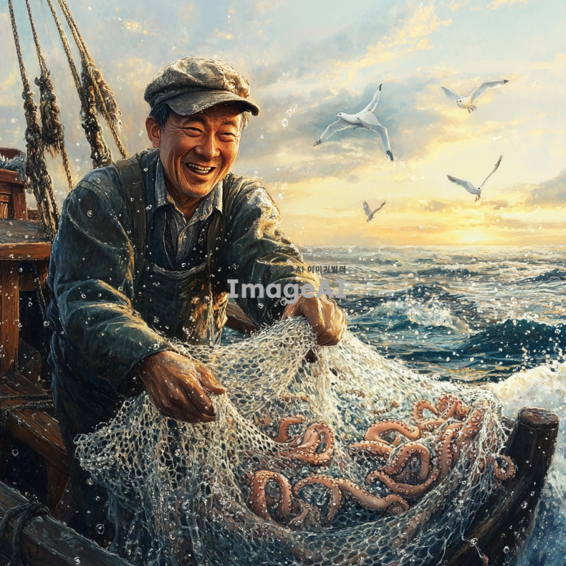 전통적인 나무 어선 위에서 한 어부가 커다란, 물이 뚝뚝 떨어지는 그물망을 힘차게 끌어올리고 있다. 그물 안에는 작은 쭈꾸미들이 가득 들어있고, 그는 이를 바라보며 따뜻하고 즐거운 미소를 짓고 있다. 그의 눈가는 기쁨으로 살짝 주름이 잡히고, 쭈꾸미들은 그물 안에서 꿈틀거리며 살아 있는 듯한 생동감을 준다.