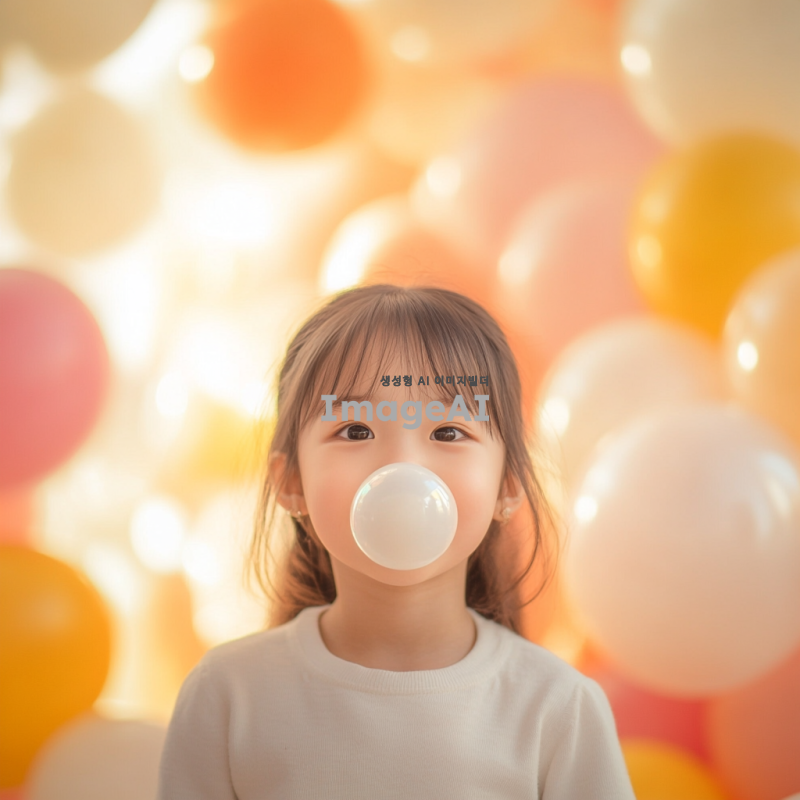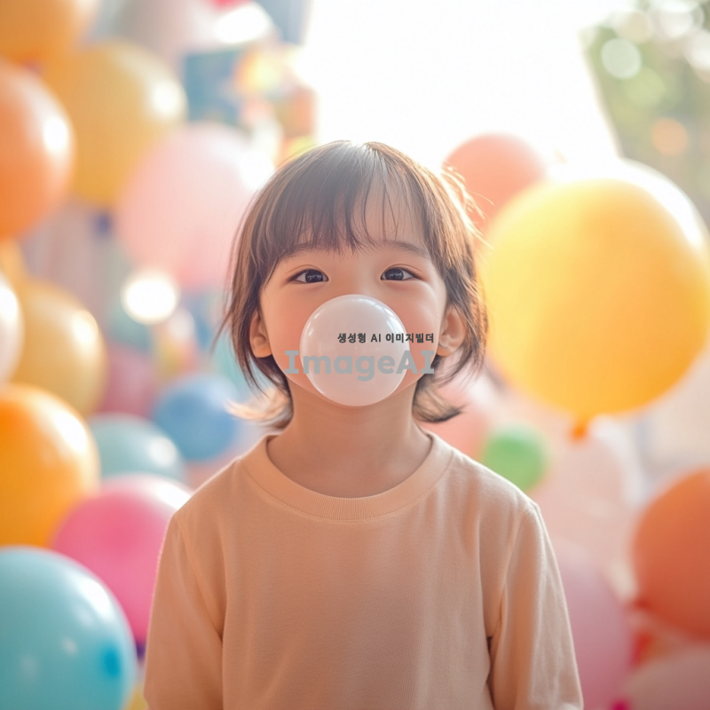 밝고 화사한 배경 속에서 풍선껌을 부는 한국인 아이의 모습. 아이는 웃고 있으며, 풍선껌이 커다랗게 부풀어 올라 있는 모습. 주변에는 다채로운 색상의 풍선과 장난감이 어우러져 있는 장면. 아이의 표정은 즐겁고 해맑으며, 햇살이 비추는 따뜻한 분위기.