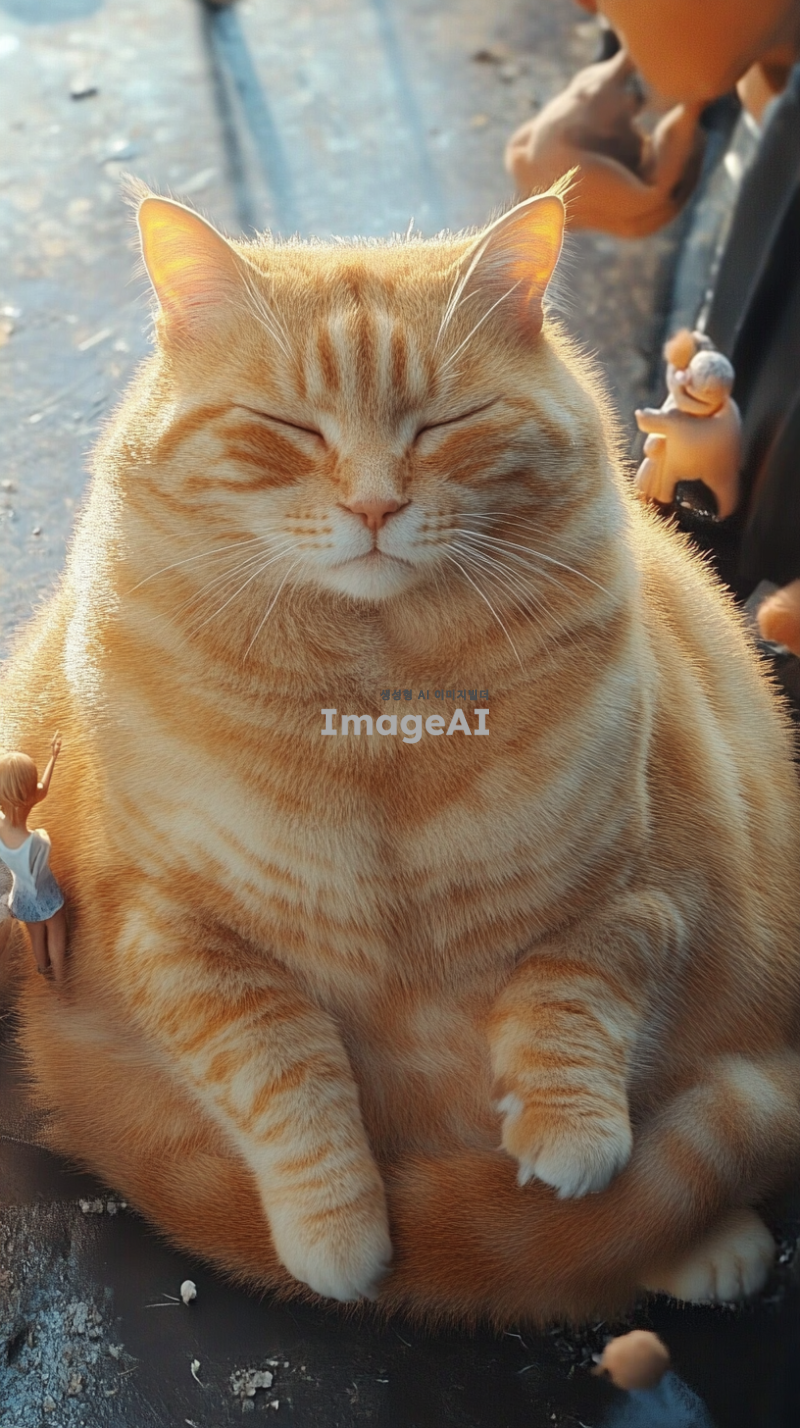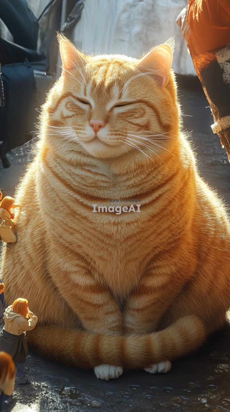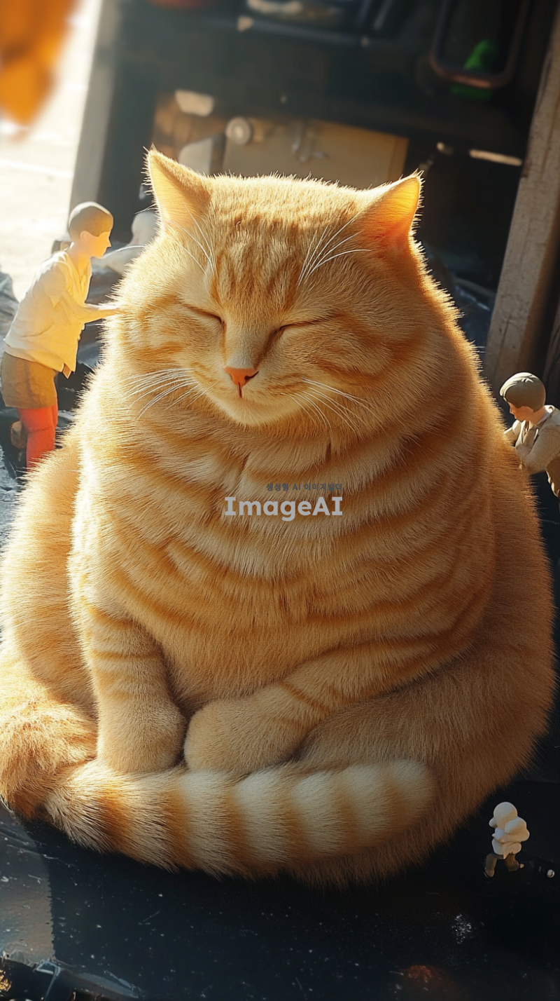 A massive, fluffy ginger cat is sitting calmly, its fur glowing warmly in the sunlight. Tiny human figures, dressed like animal caretakers, are interacting with the cat. Some are brushing its fur with oversized brushes, others are massaging its head, and a few are climbing onto its back as if exploring a soft, furry mountain. A small group is cleaning its paws with tiny towels. The scene is heartwarming and cinematic, with soft natural lighting and a cozy atmosphere. The background is blurred with warm tones, resembling a peaceful outdoor setting. Ultra-detailed, hyper-realistic, high-quality, 4K.