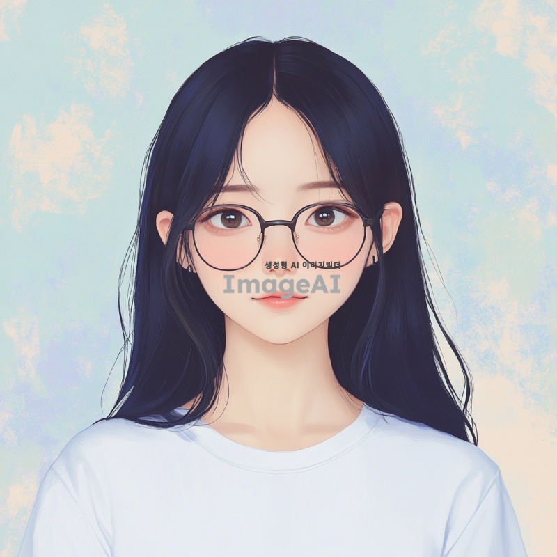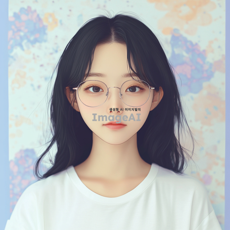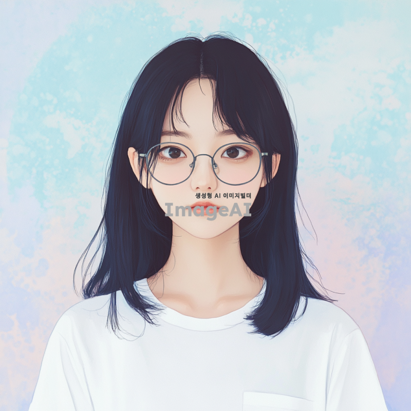 앞머리가 없는 검은머리를 가진 안경을 쓴 20대 한국 여성의 초상화. 그녀는 하얀 반팔을 입고 있으며, 배경은 부드러운 파스텔 톤으로 설정되어 있다. 그녀의 표정은 지적이고 자신감 넘치는 모습으로, 눈빛은 따뜻하고 친근한 느낌을 준다.