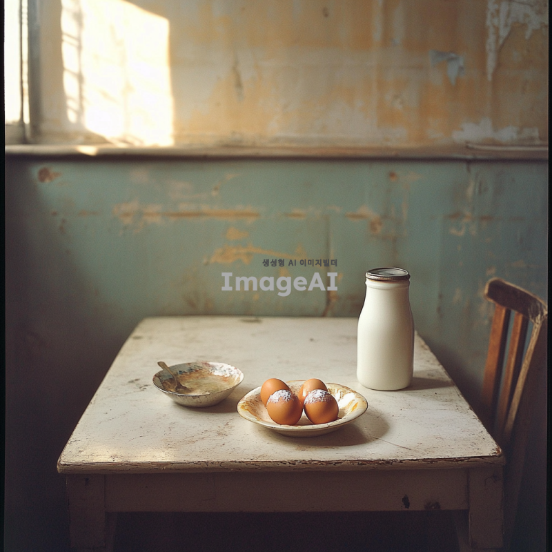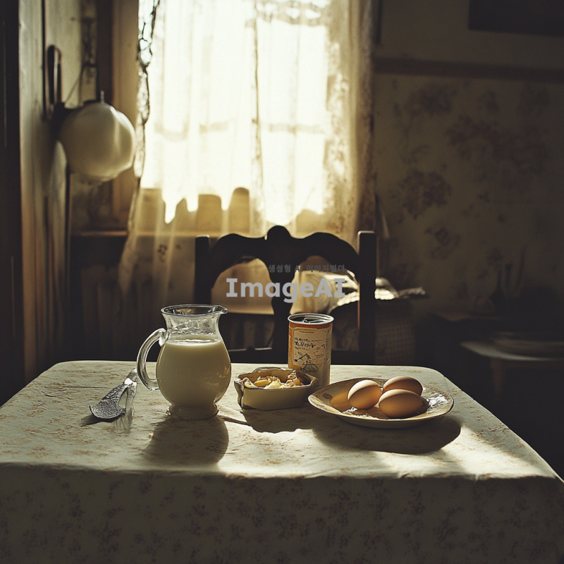 암울한 배경, 통조림과 구운계란 2개와 우유뿐인 조촐한 아침상