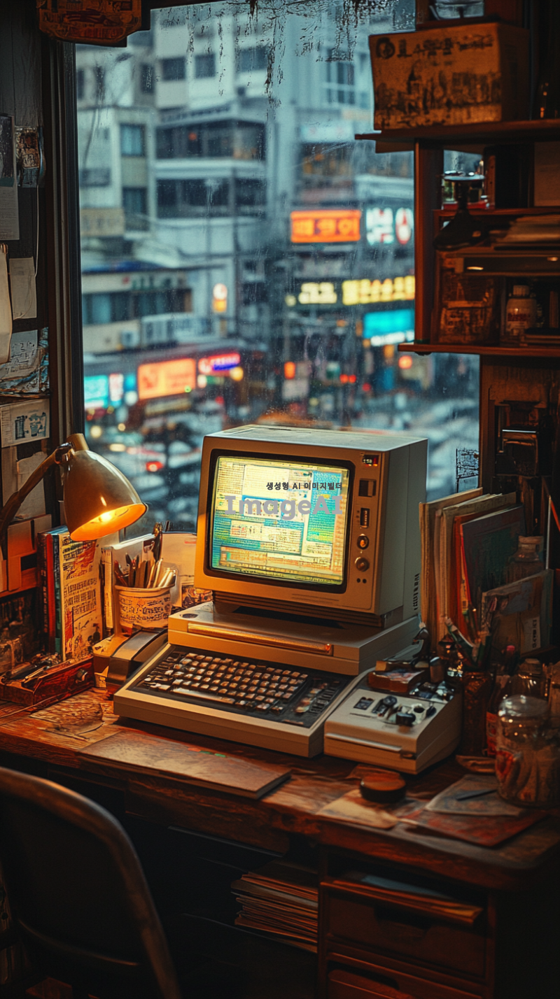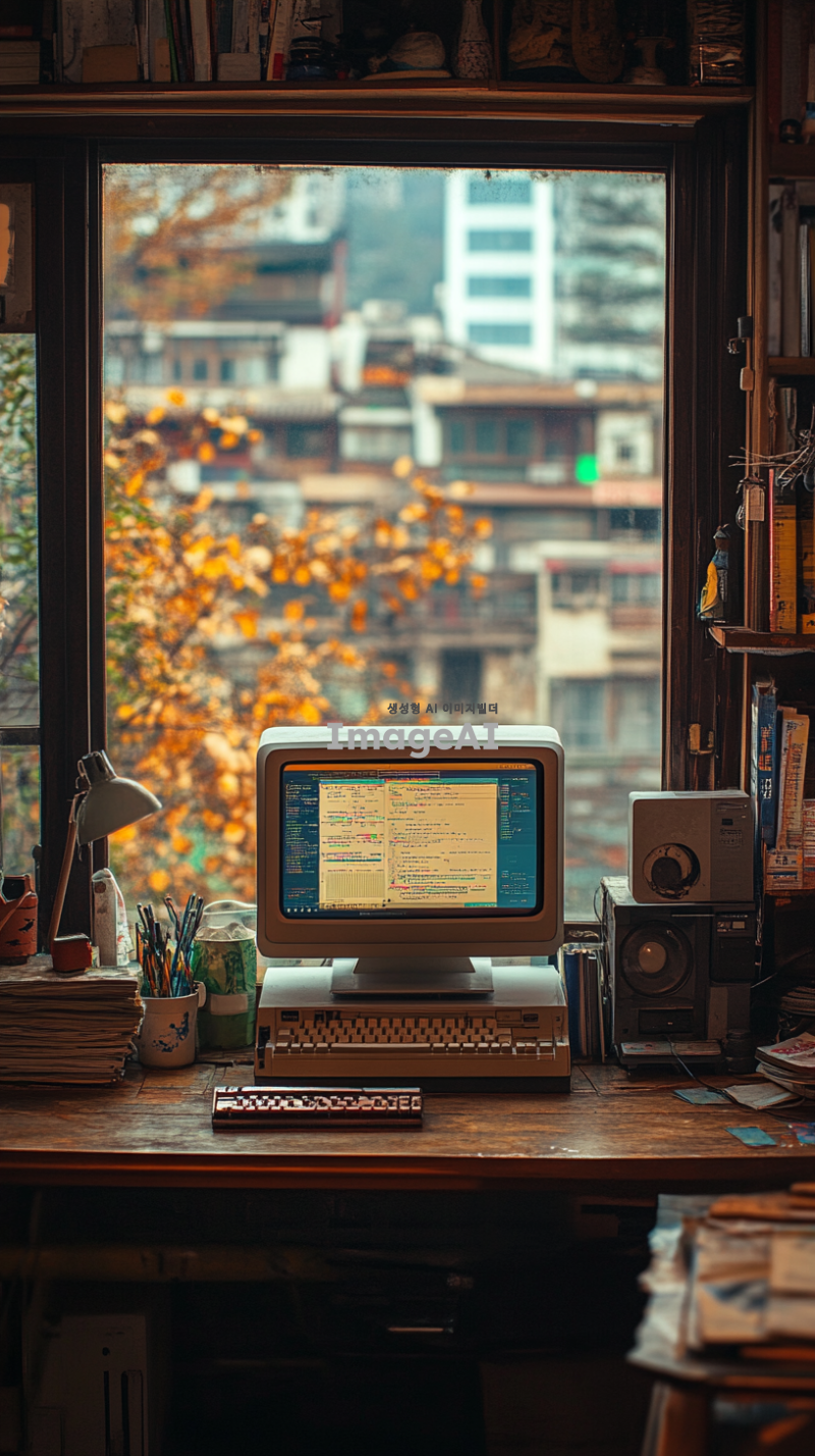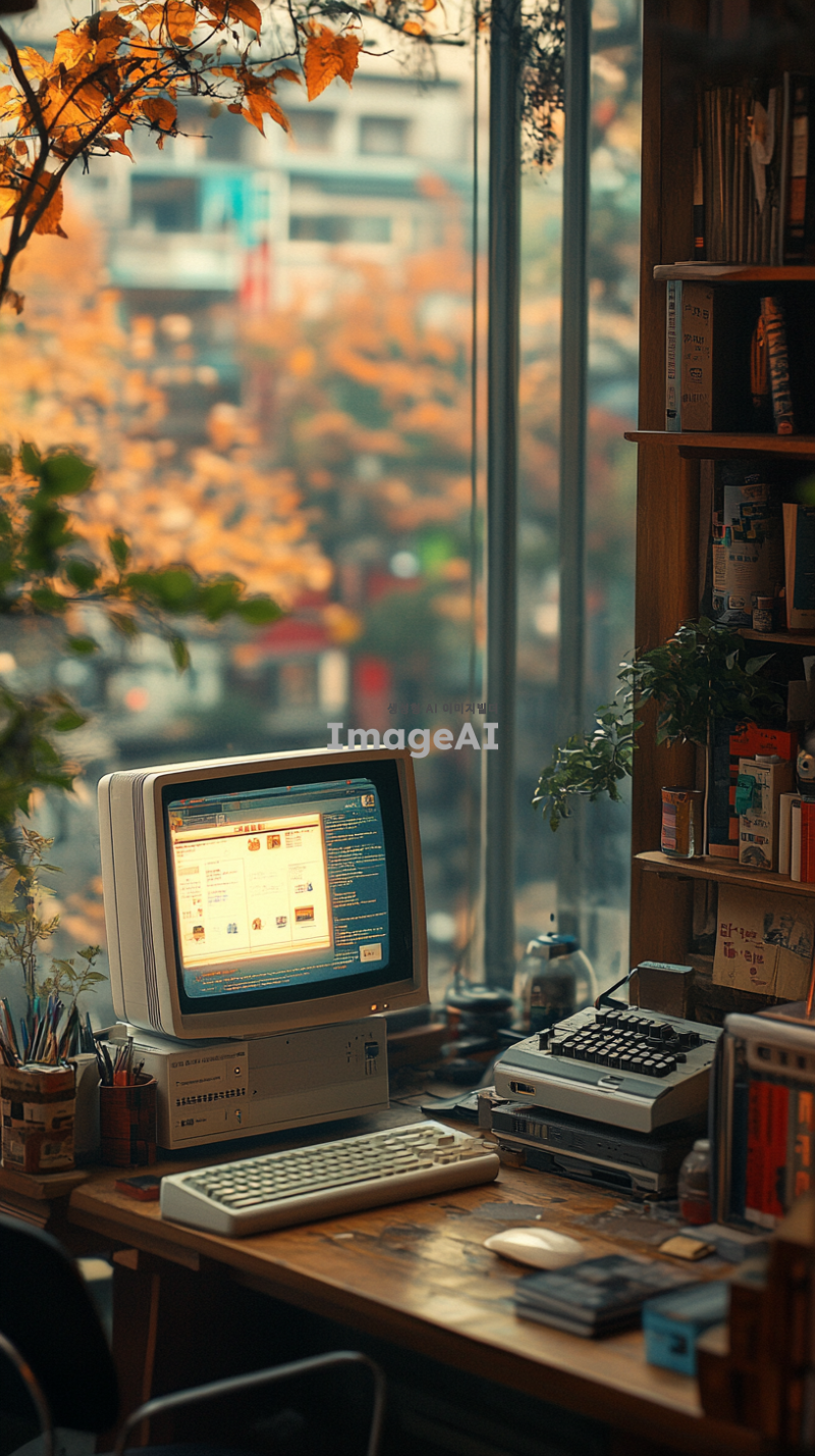 한국의 오래된 컴퓨터 방, 복고풍 디자인의 컴퓨터가 책상 위에 놓여 있고, 주변에는 오래된 책과 빈티지 소품들이 어우러져 있는 모습. 컴퓨터 화면에는 90년대 스타일의 그래픽 인터페이스가 표시되어 있으며, 창문 밖으로는 흐릿한 도시 풍경이 보이는 분위기. 따뜻한 조명 아래에서 아날로그 감성이 느껴지는 공간.