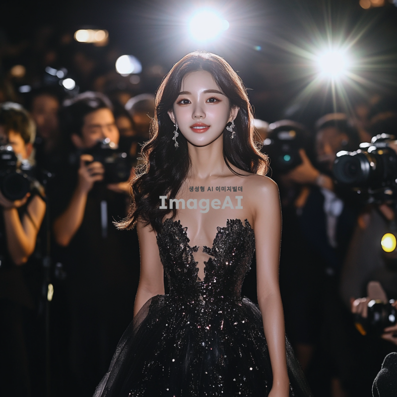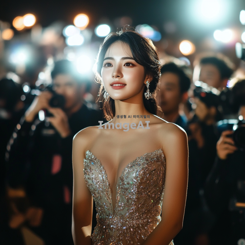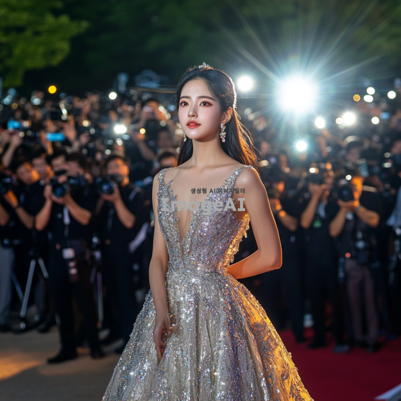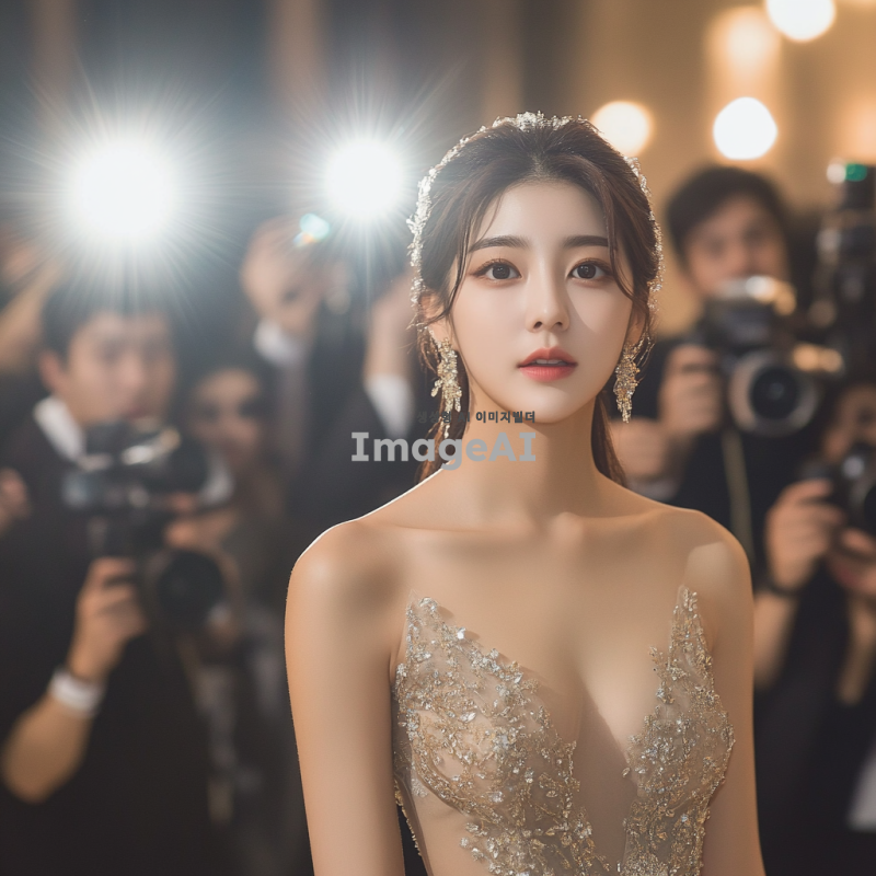 20세 한국 여성이 이브닝 드레스를 입고 기자들 앞에서 자신감 있게 포즈를 취하는 전신 사진. 배경에는 플래시를 터뜨리는 기자들과 카메라가 가득하며, 분위기는 화려하고 세련됨이 느껴진다. 여성의 표정은 당당하고 매력적이며, 드레스의 디테일이 잘 드러나도록 촬영된다.
