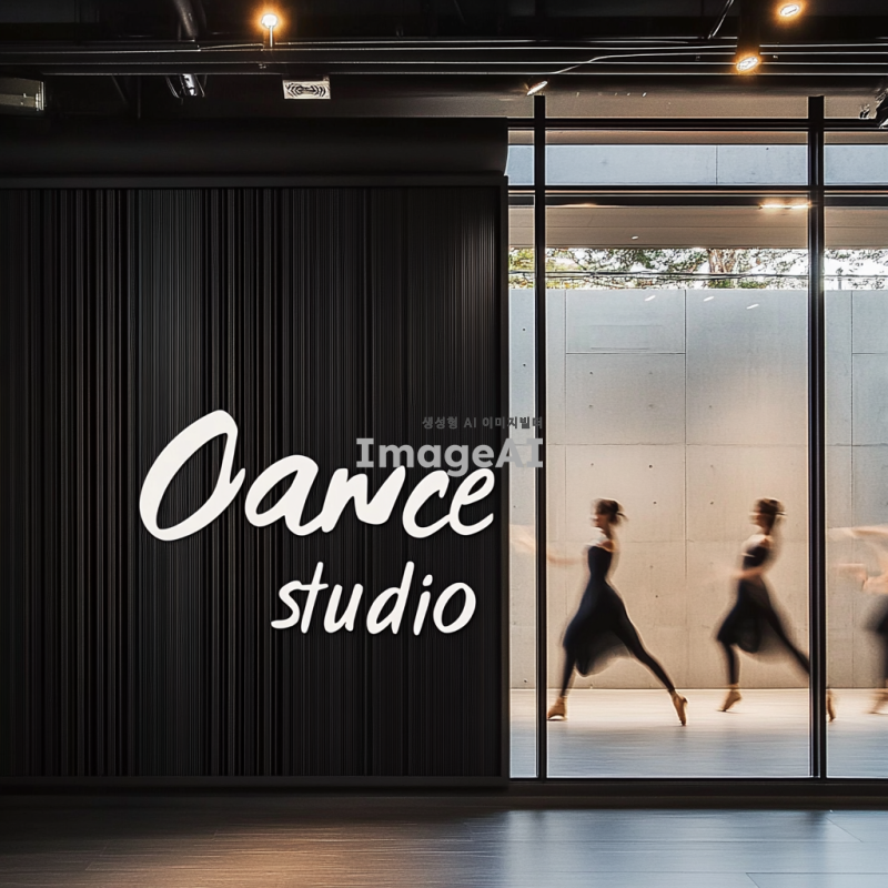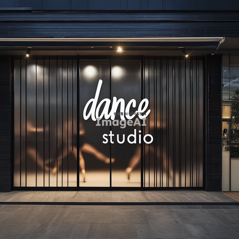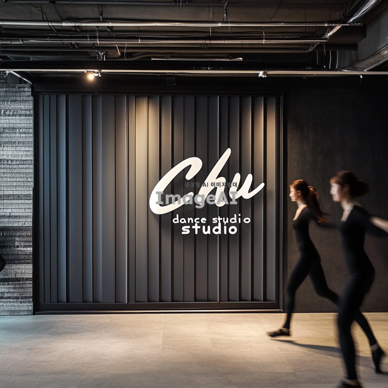 검은색 철문에 하얀색 글씨로 "chu dance studio"라고 새겨진 디자인의 시그니처 셔터를 배경으로 한 이미지. 댄스 학원 옆 벽에 설치된 모습을 보여주며, 댄스 동작을 하는 한국인 댄서들이 주변에서 연습하고 있는 장면. 현대적이고 세련된 분위기를 강조하며, 댄스의 역동성을 표현하는 요소를 포함. 밝은 조명 아래에서 셔터와 댄서들이 조화를 이루는 모습.