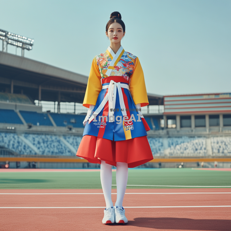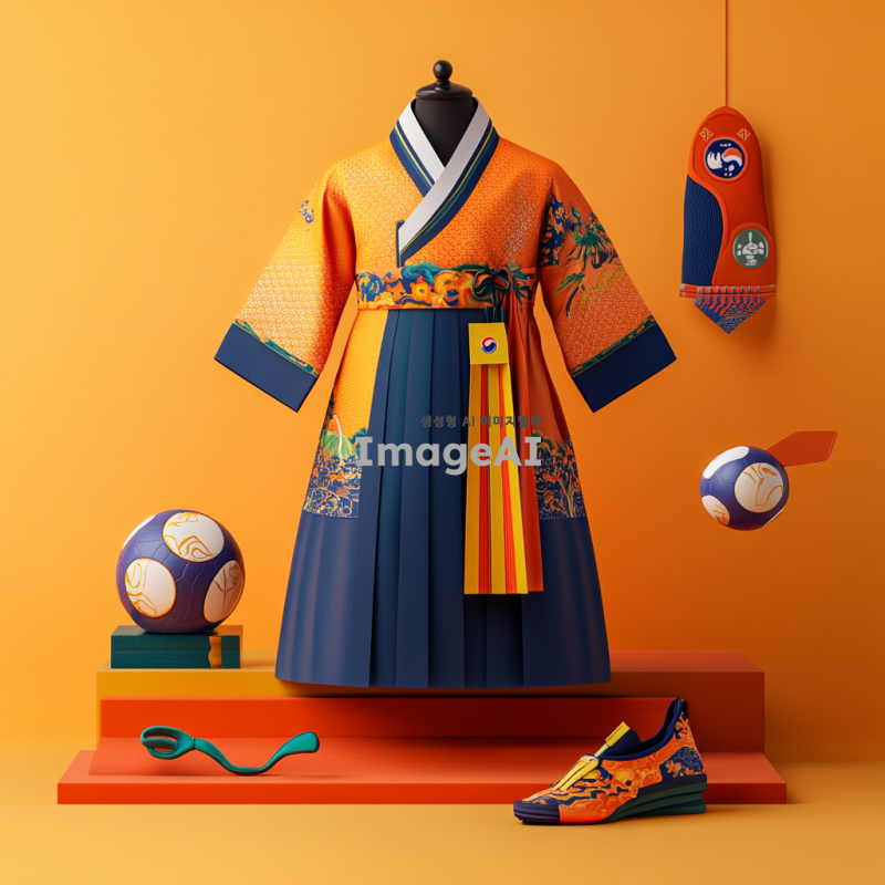 한국의 전통적인 요소와 현대적인 감각이 조화롭게 어우러진 유니폼 디자인. 밝고 선명한 색상으로 구성되며, 한복의 패턴과 디테일을 현대적인 스타일로 재해석한 디자인. 팀의 아이덴티티를 잘 표현할 수 있는 로고와 심볼이 포함되어 있으며, 기능성과 편안함을 고려한 소재로 제작된 모습. 배경은 스포츠 경기장이나 활동적인 환경을 설정하여 유니폼의 활용성을 강조.