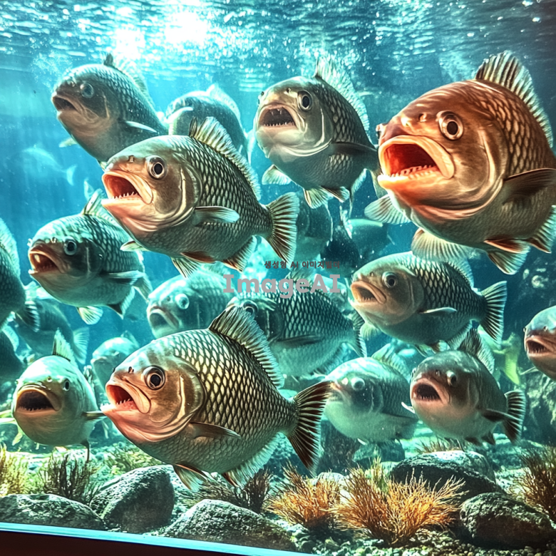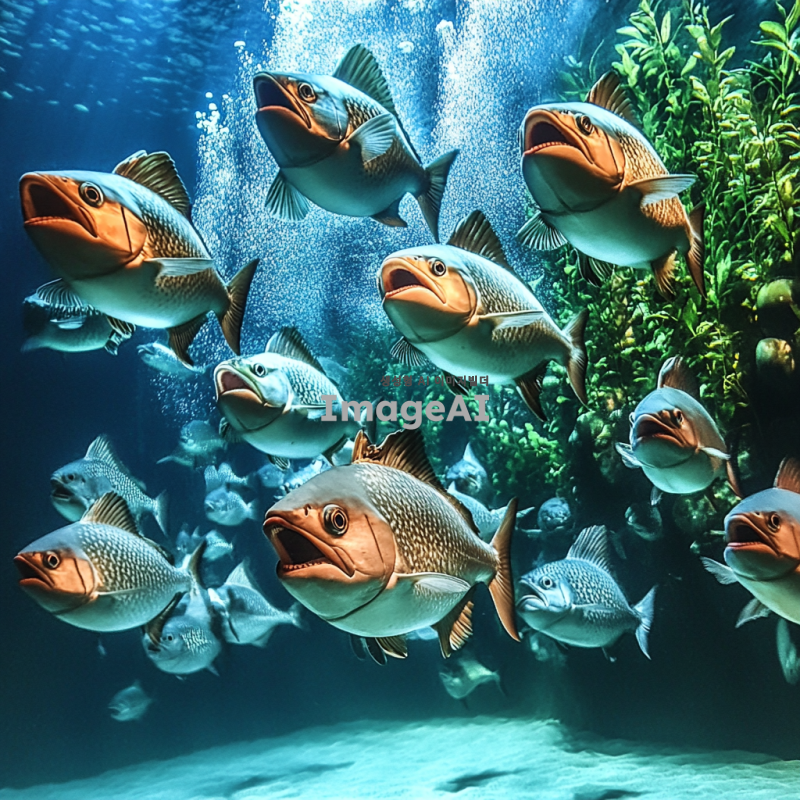 한국의 수족관에서 수영하는 피라냐, 투명한 물속에서 다양한 색상의 피라냐들이 무리 지어 헤엄치는 모습, 주변에는 수초와 바위가 있어 자연스러운 환경을 연출, 물빛은 맑고 햇빛이 비치는 장면, 생동감 있는 해양 생물의 모습.