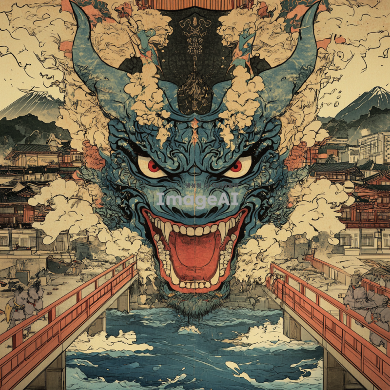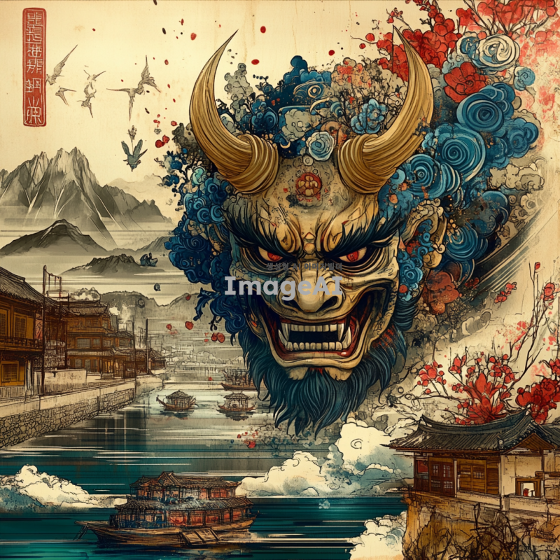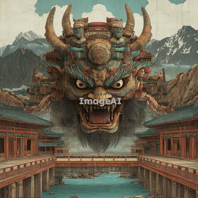 한국의 전통 탈을 기반으로 한 성경의 일곱 머리와 열 뿔을 가진 짐승을 묘사한 이미지. 짐승의 머리는 각각 독특한 디자인과 색상으로 표현되며, 열 뿔은 화려하게 장식되어 있다. 배경은 전통 한국의 풍경으로, 고즈넉한 산과 흐르는 강이 어우러져 있다. 탈의 세부 사항은 정교하고 화려하며, 한국의 전통 문양이 포함되어 있다. 전체적인 분위기는 신비롭고 경외감을 주는 느낌이다.