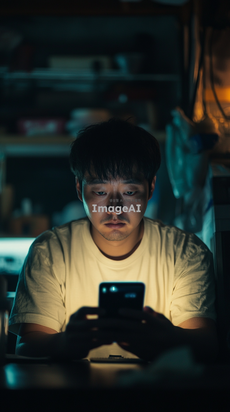 스마트폰 화면을 바라보며 무기력한 표정을 짓고 있는 한국인 남성의 모습. 어두운 방 안에서 희미한 스마트폰 불빛이 얼굴을 비추고 있으며, 그의 눈은 피곤하고 무기력해 보인다. 주변은 정돈되지 않은 모습으로, 불안한 감정을 전달하는 요소들이 배경에 배치되어 있다.