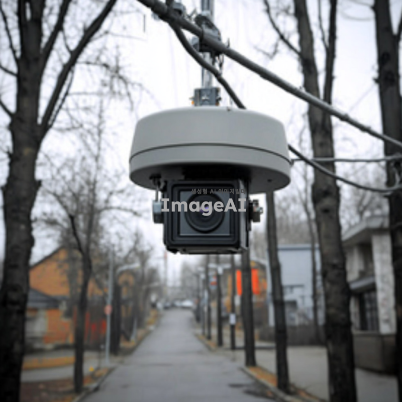 전봇대 사이에 설치된 레일에 매달려 움직이는 카메라의 모습, 카메라는 현대적인 디자인으로, 주변 풍경은어두운 골목길을 표현하고, 전봇대는 튼튼하고 깔끔하게 정렬되어 3~4개 정도 있으며, 4갈래로 되어있는 골목에 카메라가 레일을 따라 부드럽게 이동하고 있는 모습, 전체적으로 기술과 배경이 조화를 이루는 느낌.