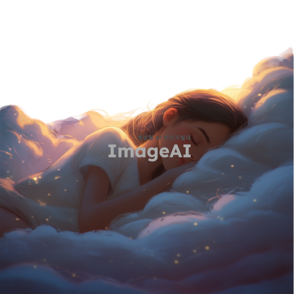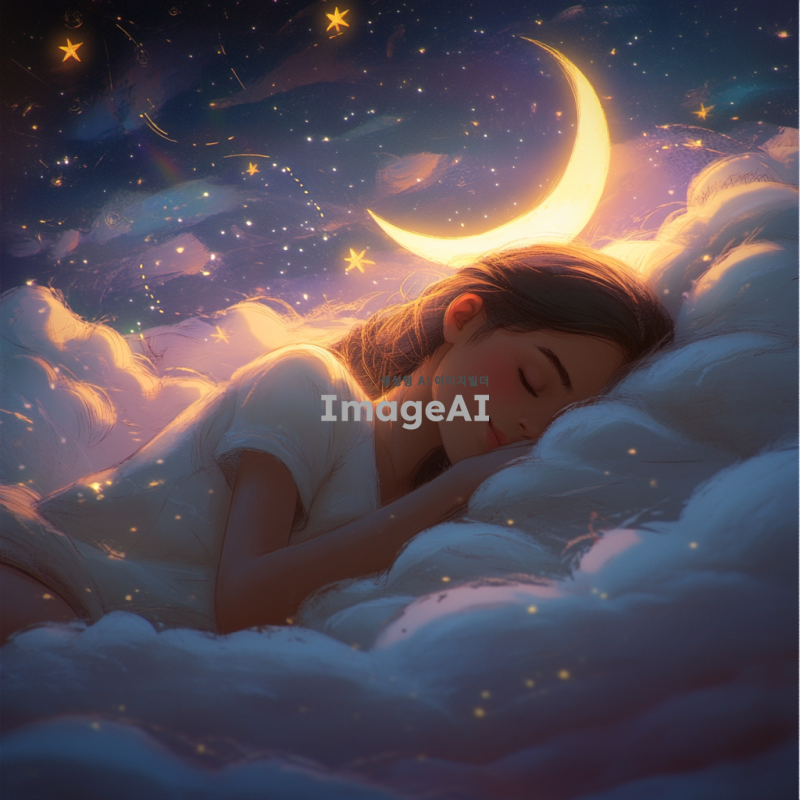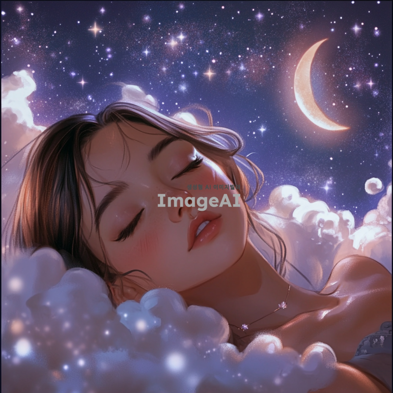 밤하늘에 별들이 반짝이고 초승달이 떠있다. 그 앞에 구름 이불을 덮고 편안한 표정으로 잠든 여성의 모습. 여성의 크기는 전체 이미지의 1/3 정도로 설정하며, 애니메이션 느낌으로 그려준다.
