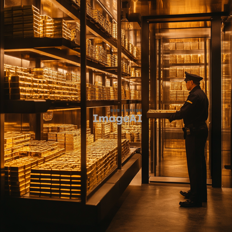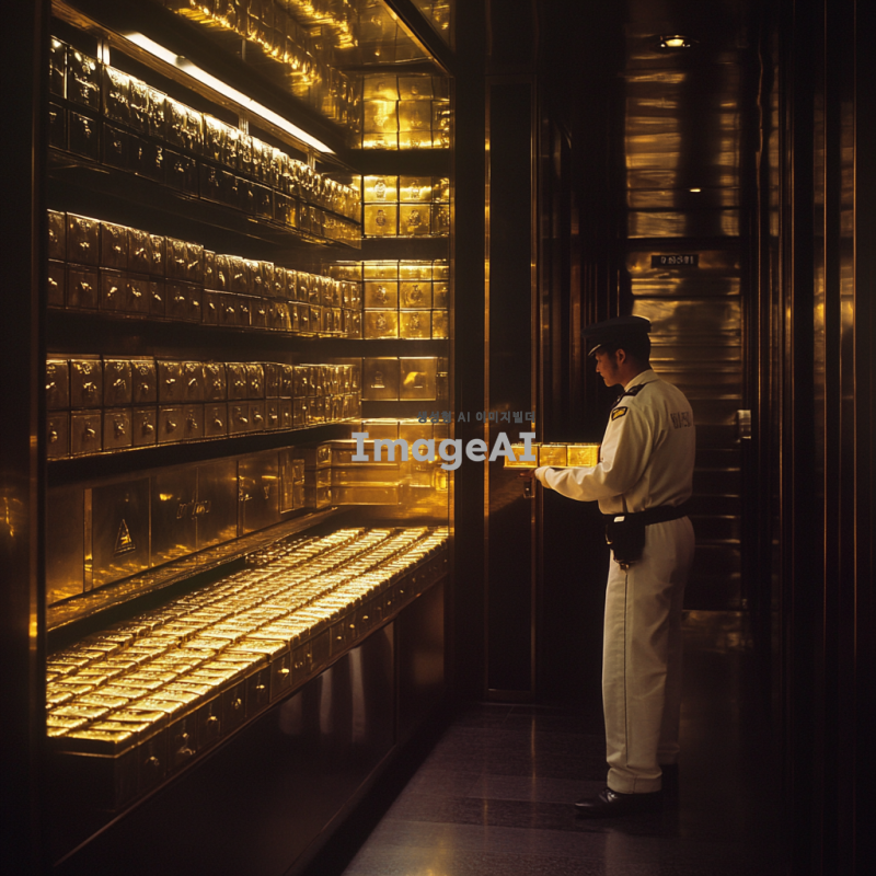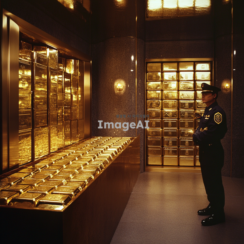 금으로 가득 찬 은행 금고 내부, 반짝이는 금괴들이 정렬되어 있고, 고급스러운 인테리어의 은행 환경, 따뜻한 조명이 비추는 모습, 한국인 경비원이 금고를 지키고 있는 장면, 세련된 느낌의 디자인, 고급스러운 분위기