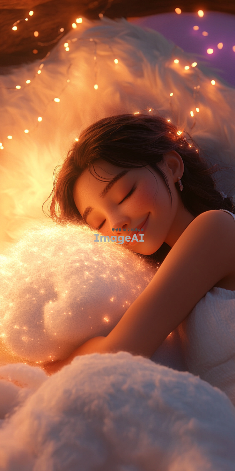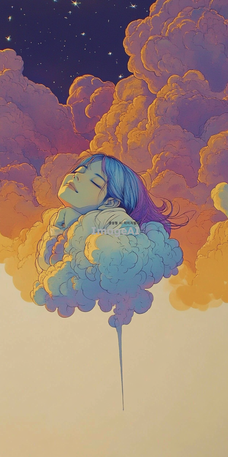구름에 기대어 잠든 한국인 여성, 흰 원피스를 입고 있으며, 구름을 안고 편안하게 잠들고 있는 모습. 미소를 지으며 아늑한 분위기를 자아내고, 배경은 노란색과 보라색의 그라데이션 하늘. 전체적으로 밝은 파스텔톤으로 따뜻하고 편안한 느낌을 주며, 영화 '마리 이야기' 애니메이션 스타일의 그림체로 표현. 여성이 전체 이미지의 1/3 크기로 배치.
